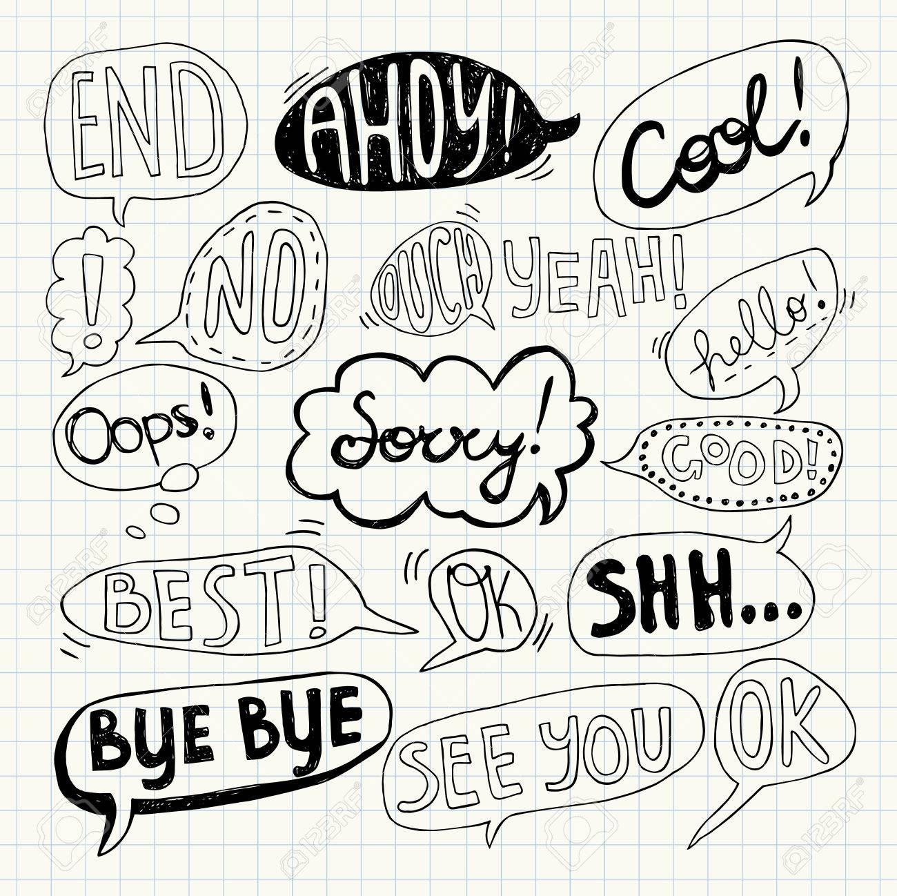 Vettoriale Disegnati A Mano Set Di Fumetti Con Testo Scritto A Mano Ciao Ciao Scusa Arrivederci Oops Meglio Si Buono Freddo Ahoy Fine Ok Ciao No Si Ahi Image 79160570