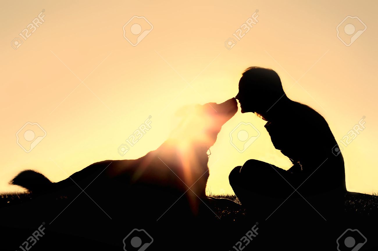 Immagini Stock Una Silhouette Di Una Giovane Donna Felice E Seduto Fuori Al Tramonto Con Amore Bacia Il Suo Grande Cane Mix Di Razza Pastore Tedesco Image 28077857