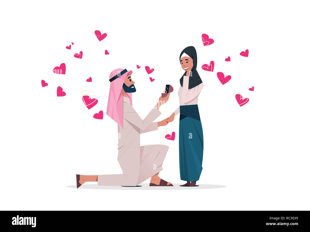 Uomo Arabo Inginocchiato Tenendo Anello Di Fidanzamento Proponendo La Donna Araba Di Sposare Lui Felice Il