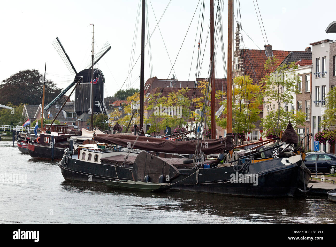 Le Navi Nel Porto Storico Nella Citta Di Leiden Con Sullo Sfondo Il Mulino A Vento De Mettere Foto Stock Alamy