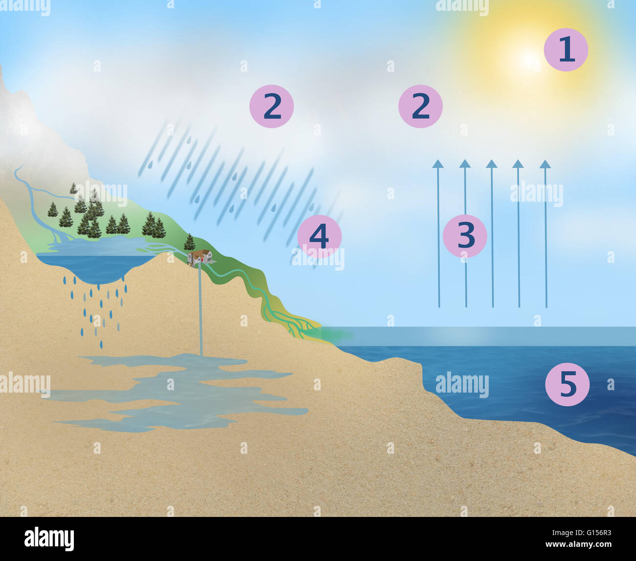 Illustrazione Della Terra Del Ciclo Dell Acqua In 5 Fasi 1 La Condensazione Di Vapore Acqueo 2 La Formazione Di Nube 3 Evaporazione 4 Precipitazione 5 Sorgente D Acqua Vedere Ja0529 Per Lo Schema