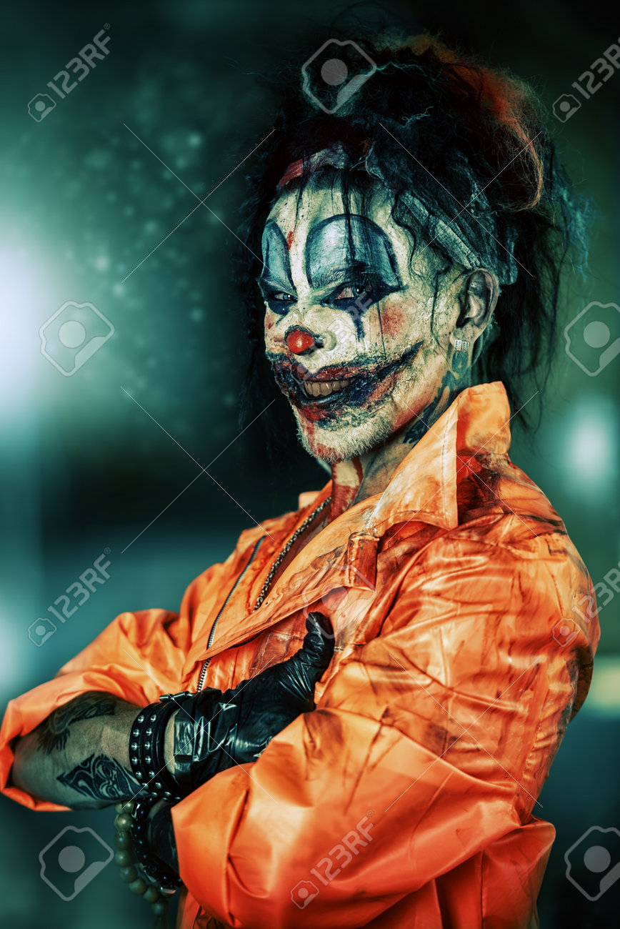 Immagini Stock L Uomo Sinistro Del Pagliaccio Macchiato Di Sangue E In Una Casa Abbandonata Pagliaccio Zombie Maschio Halloween Orrore Image 86281983