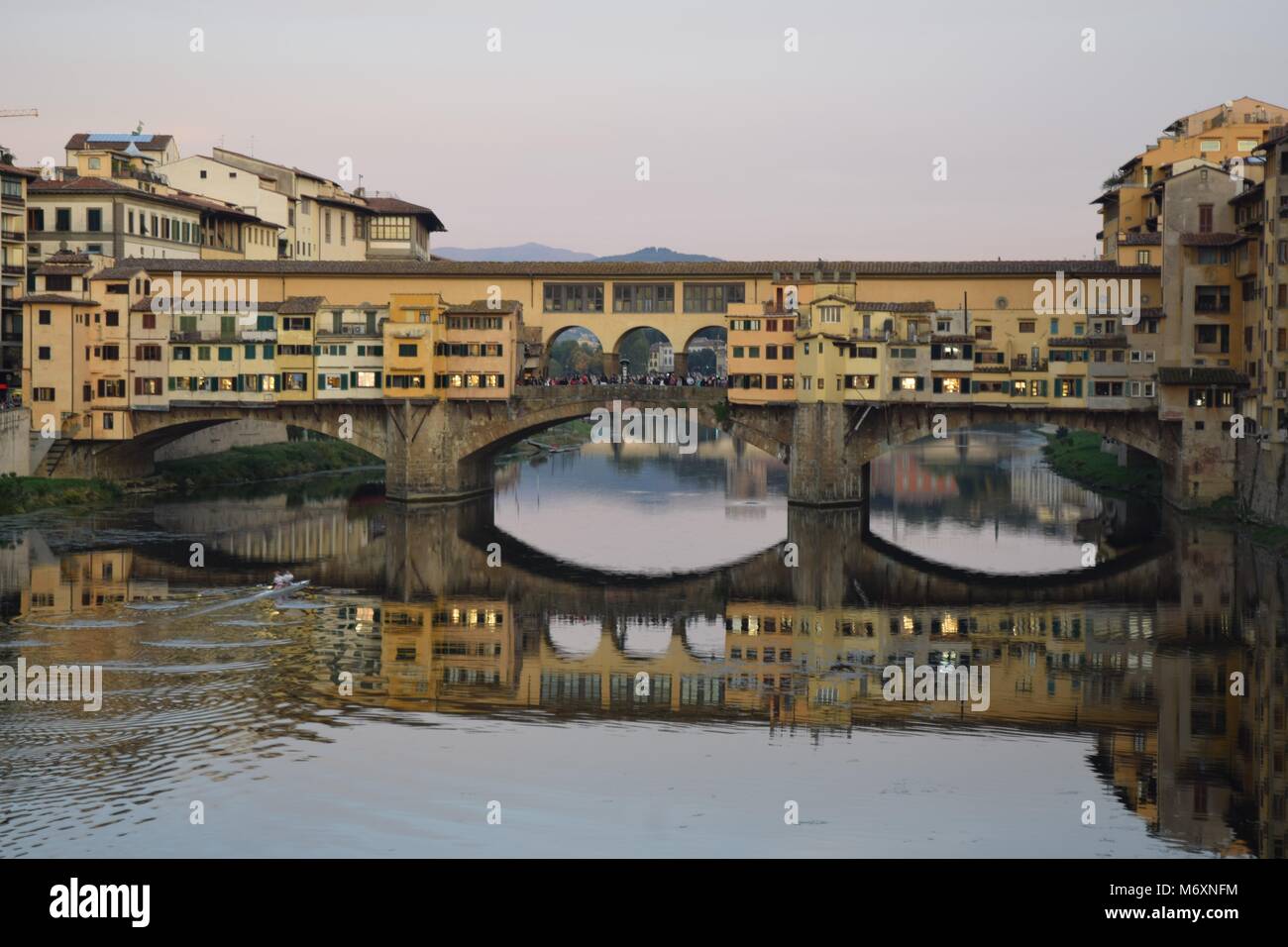 Ponte Sull Arno Una Vista Del Ponte Vecchio Di Firenze Toscana Mentre Sotto Di Esso Il Riflesso Nel Fiume Arno E Trafitto Da Due Rematori Foto Stock Alamy