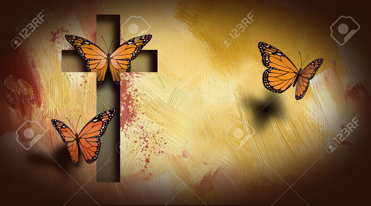 Immagini Stock Composizione Grafica Della Croce Di Gesu Che Libera Un Trio Di Belle Farfalle Arte Adatta Per Il Possibile Utilizzo Come Copertina Di Biglietti Di Auguri E Immagine Indipendente Image 76049387