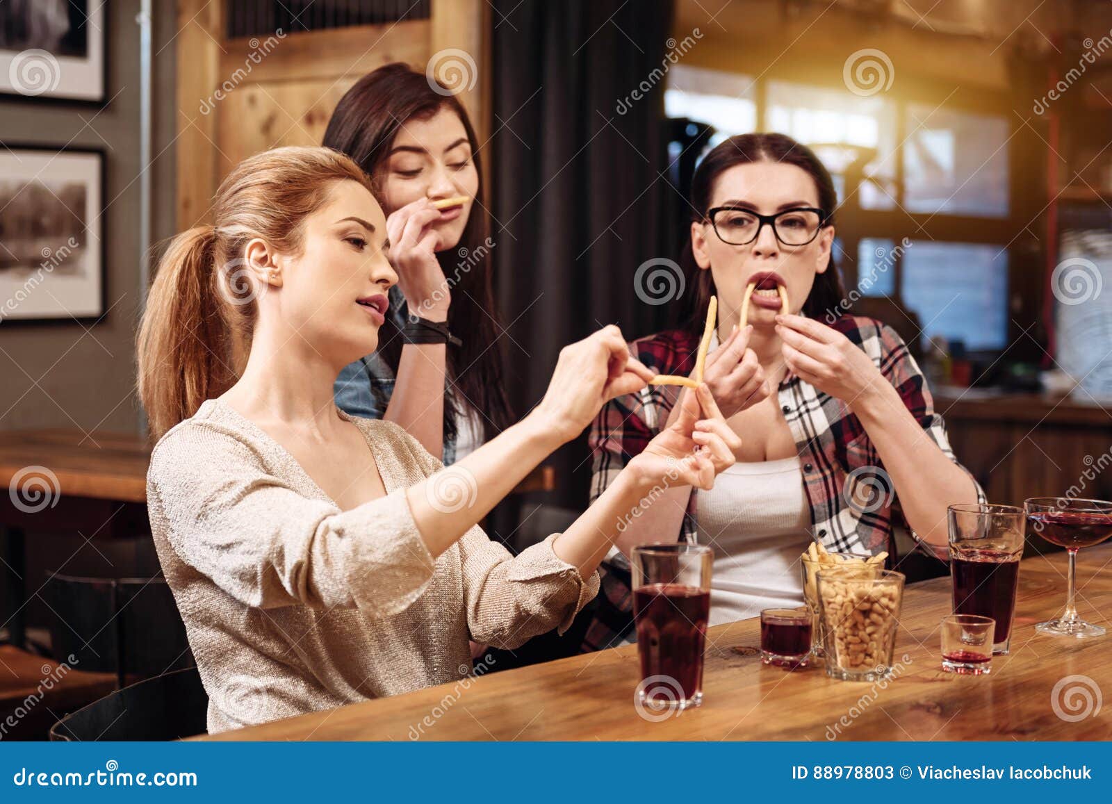Belle Donne Che Giocano Con Le Patate Della Fritta Immagine Stock Immagine Di Giocano Patate 88978803