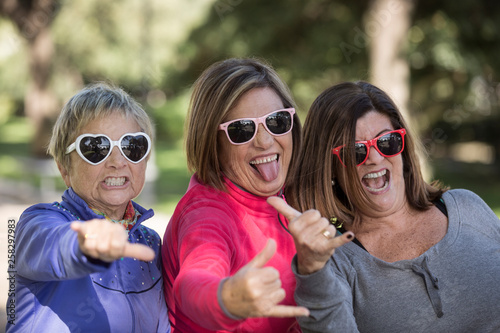 Gruppo Di 3 Amiche Mature Ridono Felici Con Occhiali Da Sole Spiritosi Sfondo Parco Buy This Stock Photo And Explore Similar Images At Adobe Stock Adobe Stock