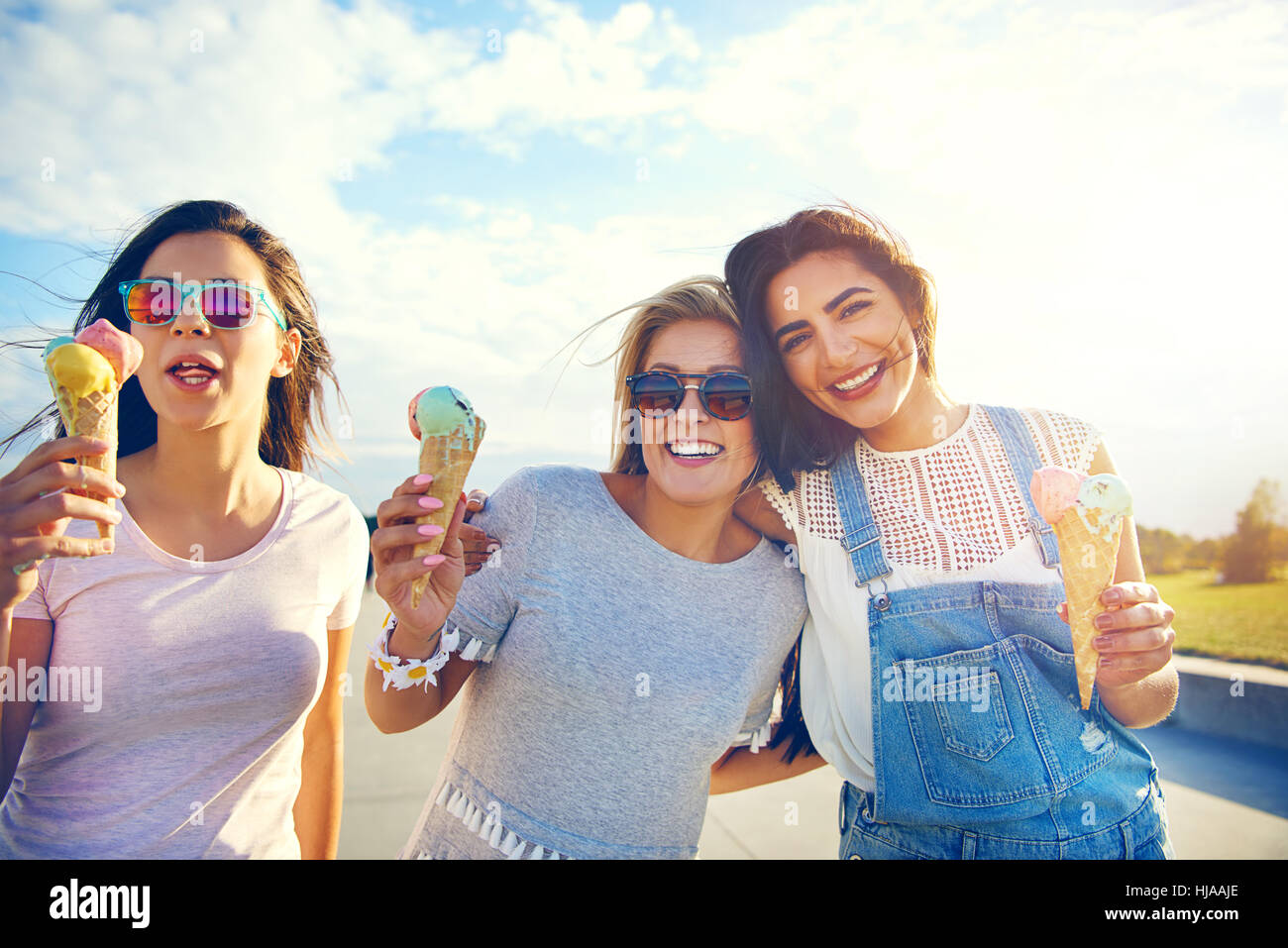 Tre Amiche Godendo Di Un Estate Trattare Camminando A Braccetto Sulla Passeggiata A Mare Di Mangiare Colorato Gelato Italiano Nel Coni Foto Stock Alamy