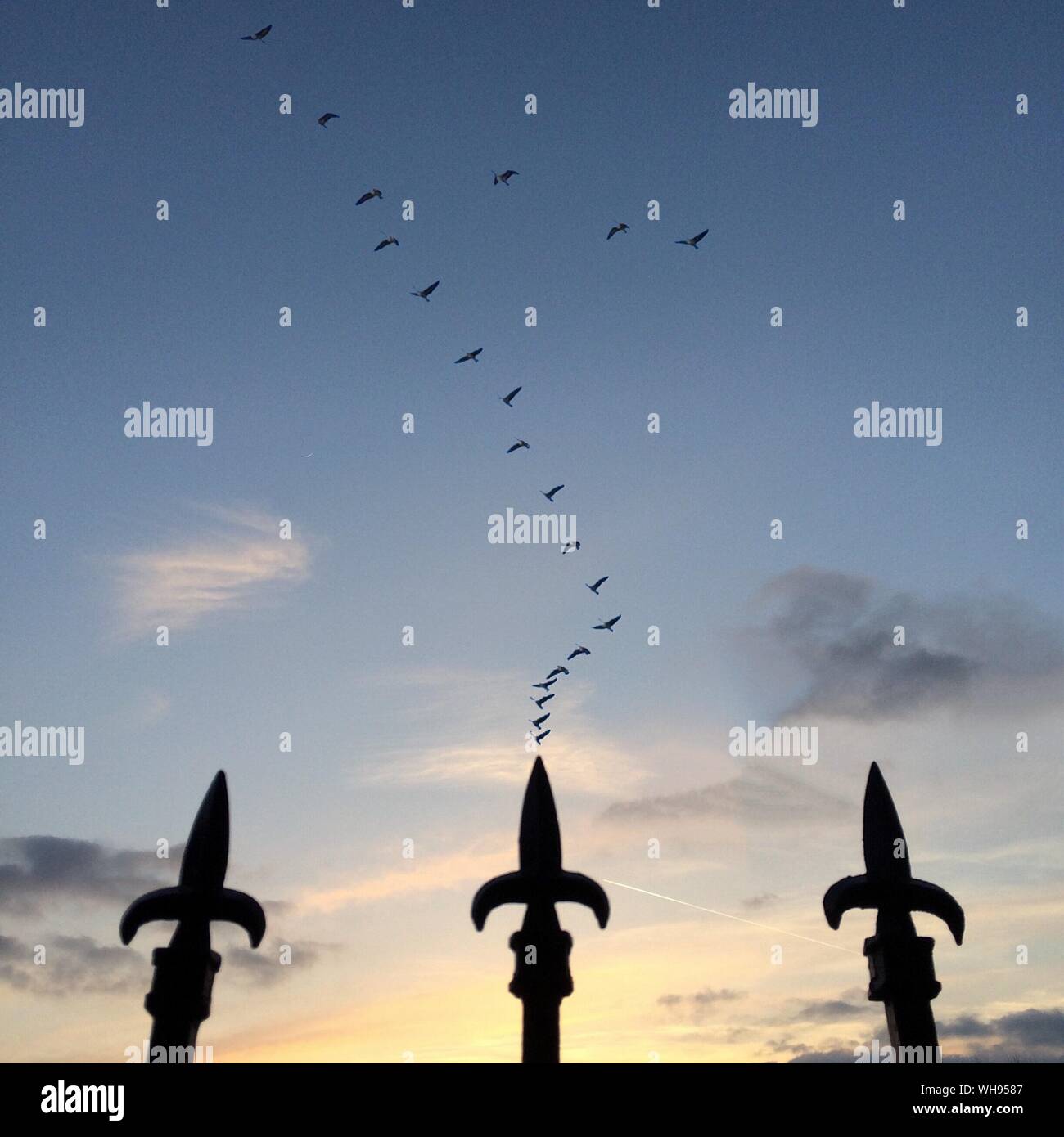 Basso Angolo Vista Di Silhouette Di Uccelli Che Volano Sopra Porta Di Metallo Contro Sky Foto Stock Alamy