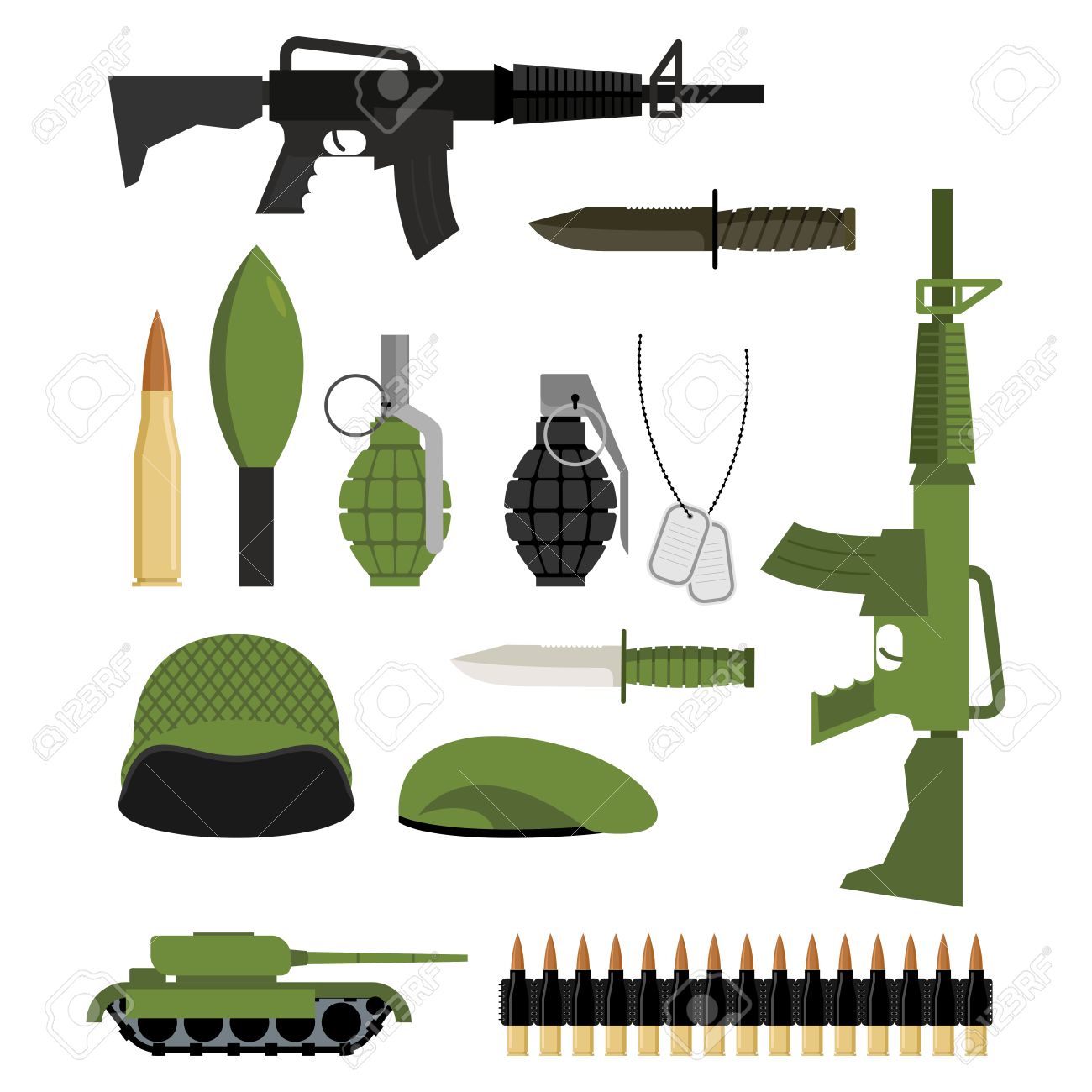 Vettoriale Set Di Icone Per Armi Da Guerra Le Unita Militari Serbatoio E Granata I Soldati Casco E Berretto Verde Automatico E Testata Raccolta Militare Di Armi Image 47647669