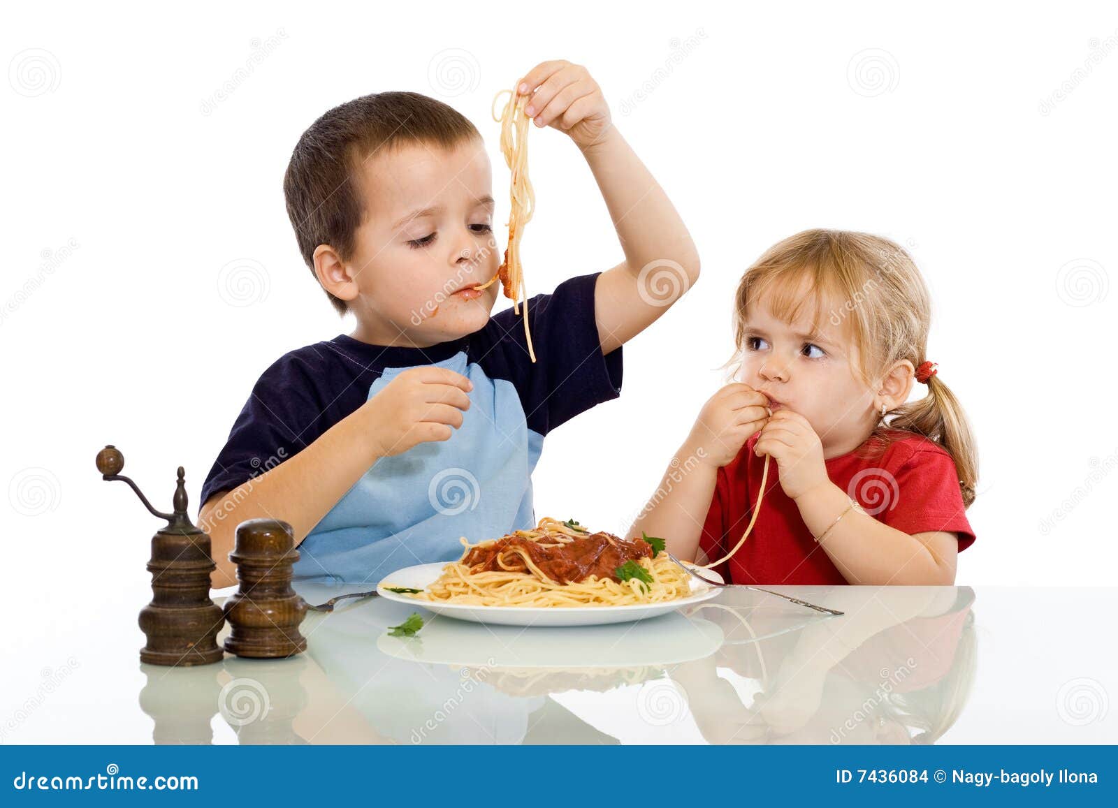 Due Bambini Che Mangiano Pasta Con Le Loro Mani Fotografia Stock Immagine Di Piastra Cute 7436084