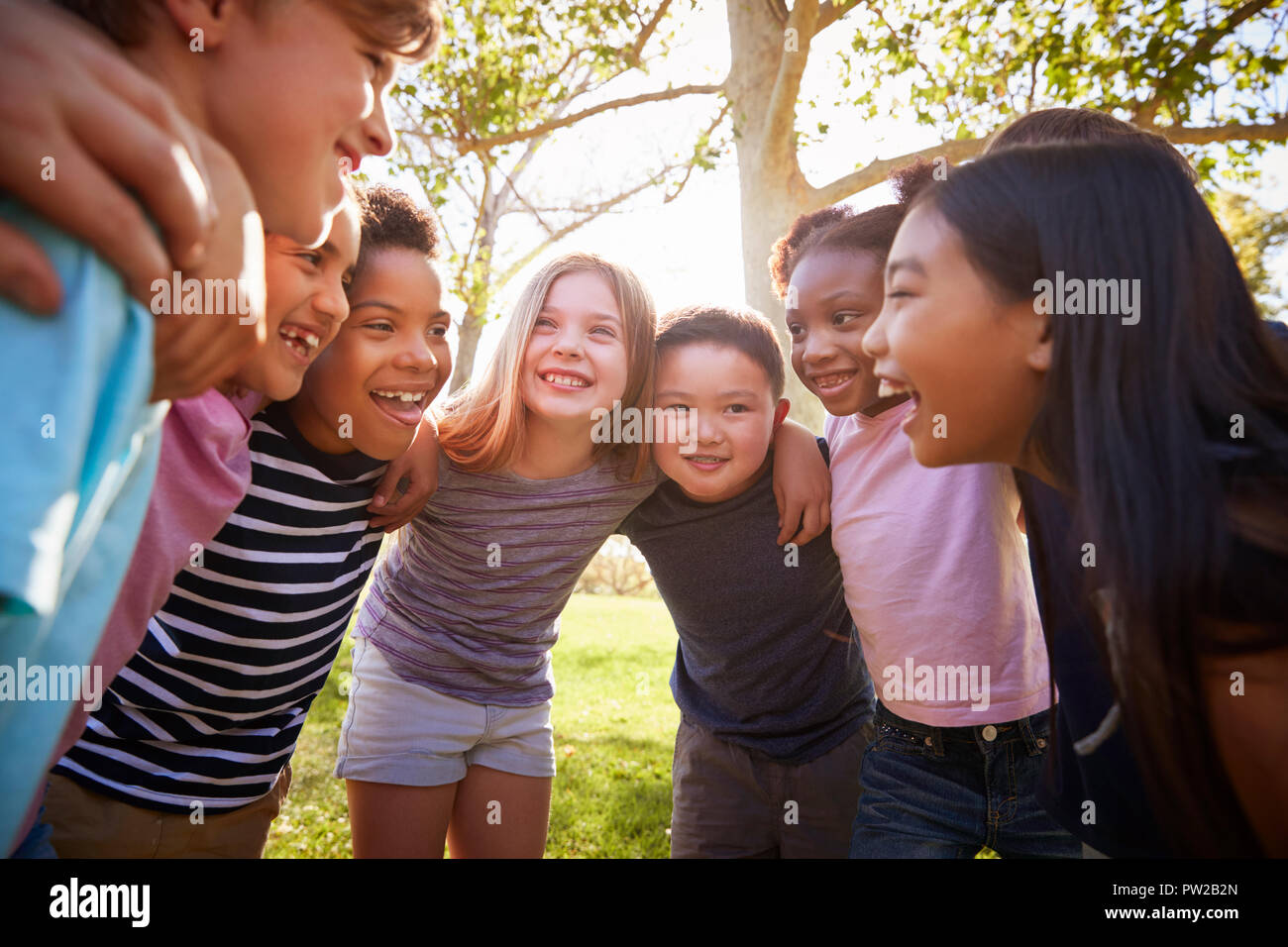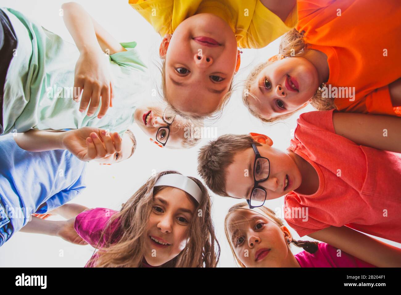 Squadra Di Bambini Sorridenti Che Si Abbracciano Insieme In Un Cerchio Vista Dal Basso Foto Stock Alamy