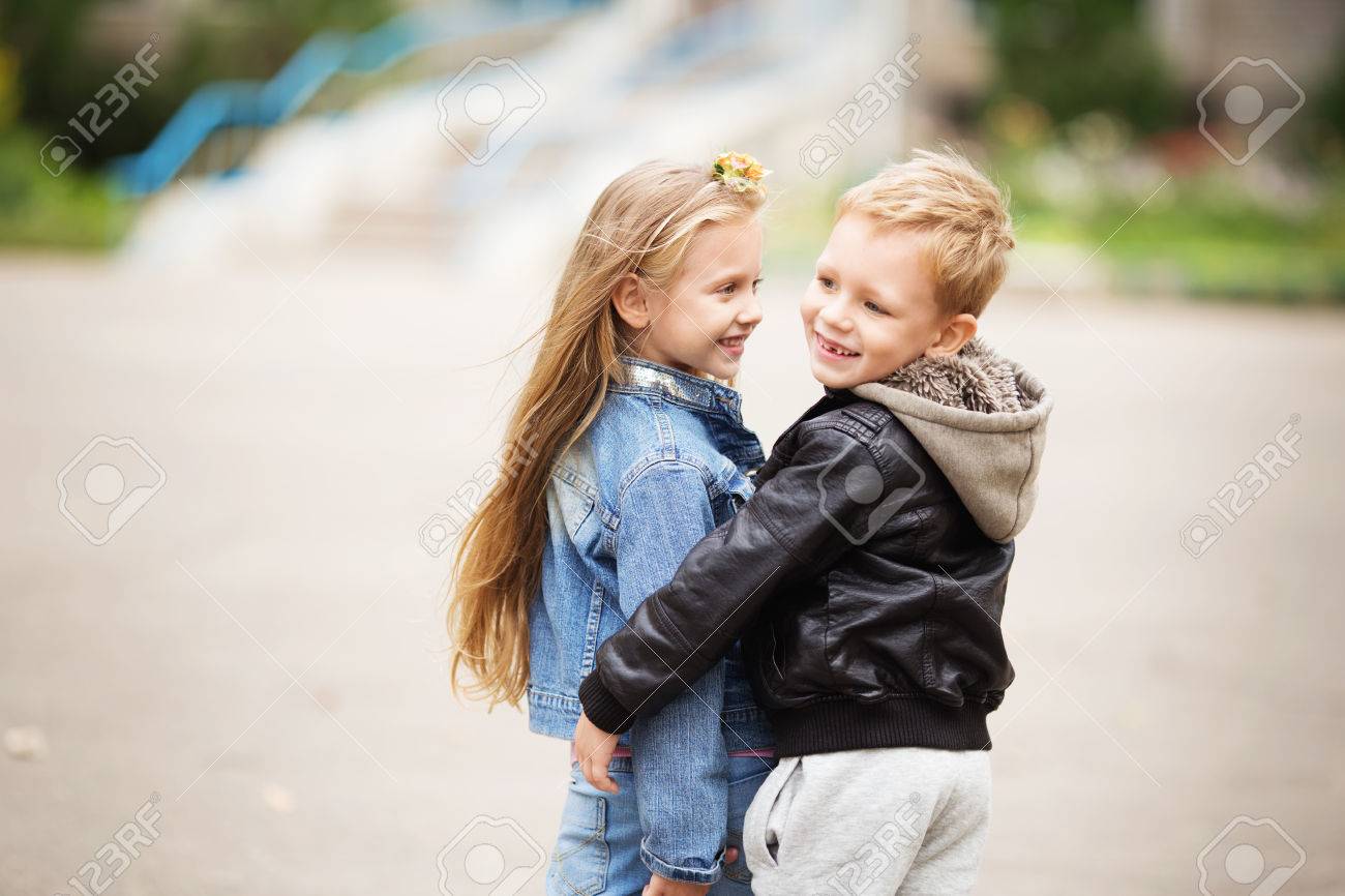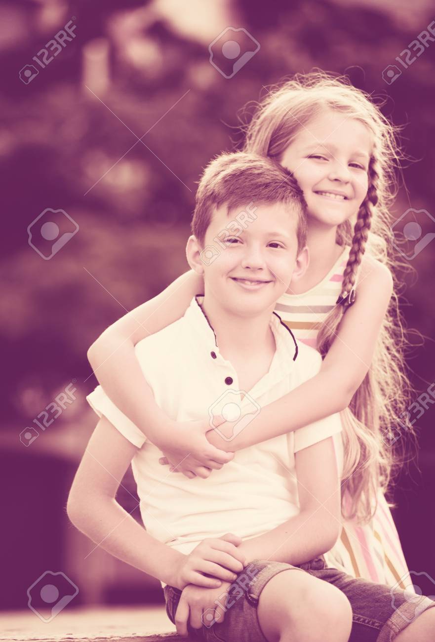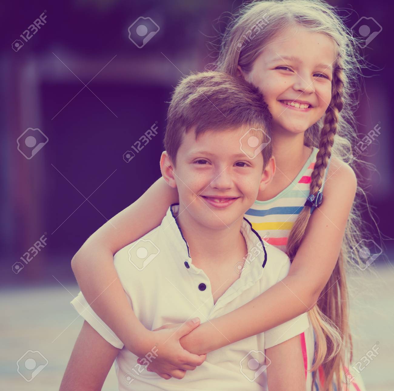 Immagini Stock Due Bambini Sorridenti In Eta Scolare Si Abbracciano In Citta Image 80192519