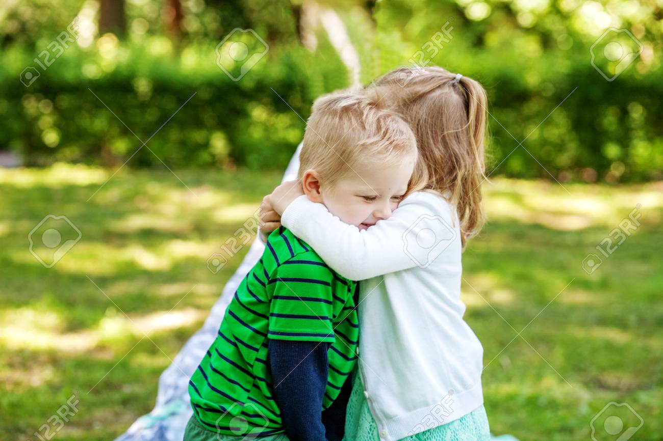 Immagini Stock I Bambini Si Abbracciano In Giardino 2 3 Anni Ragazza E Ragazzo Il Concetto E Infanzia E Famiglia Image 95922258