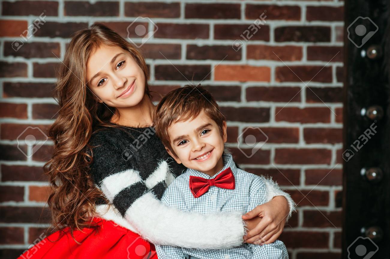 Immagini Stock Ragazzino E Ragazza Che Sorride E Che Abbraccia Su Una Priorita Bassa Del Mattone In Vestiti Di Modo I Bambini Fratello E Sorella Sono Felici E Si Amano Concetto