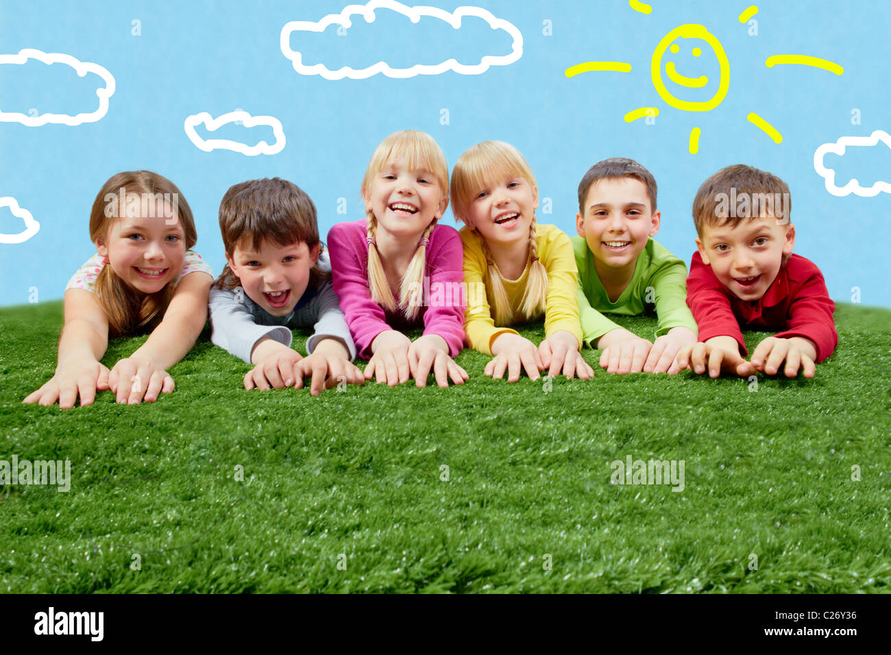 Gruppo Di Bambini Felici Sdraiati Su Un Prato E Stirando Le Loro Mani Foto Stock Alamy