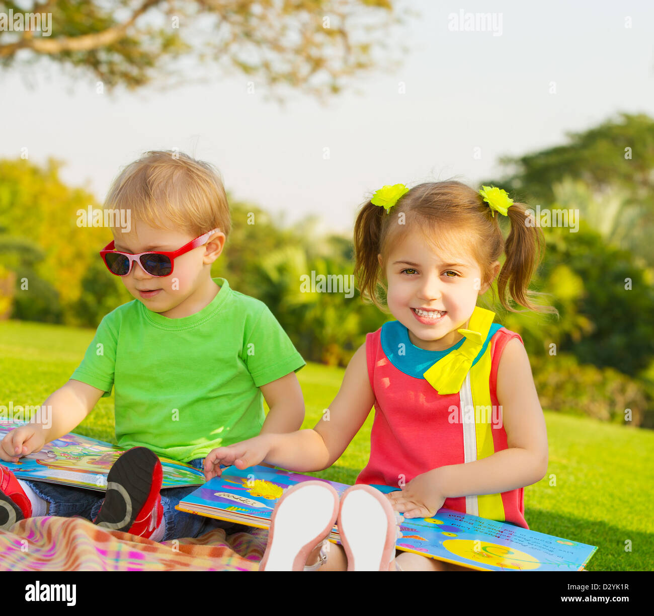 Foto Di Bambini Leggere Il Libro All Aperto In Asilo Nido Due Bambini Felici Godendo Di Favola Fratello E Sorella Di Studiare La Lezione Foto Stock Alamy