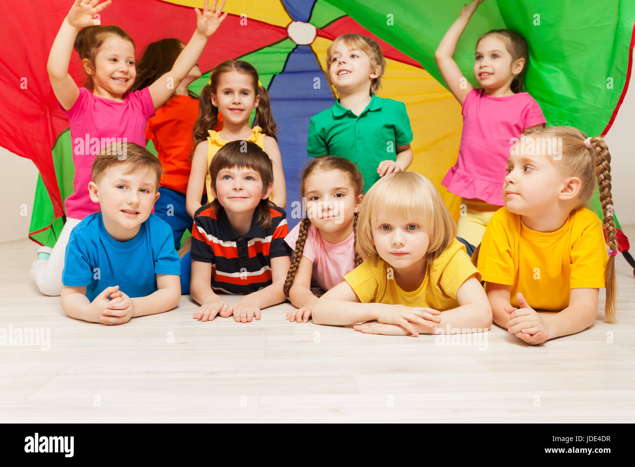 Grande Gruppo Di Bambini Felici Che Si Nasconde Sotto La Tettoia Fatta Di Rainbow Paracadute Durante I Giochi Di Sport Nella Scuola Materna Foto Stock Alamy