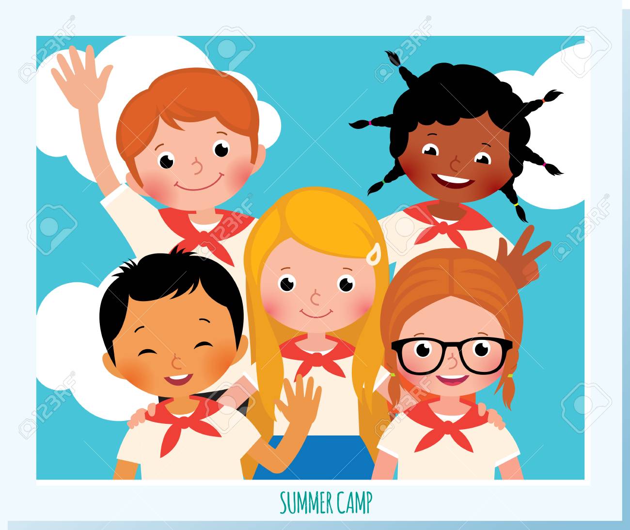 Vettoriale Un Gruppo Di Bambini Felici In Un Campo Estivo Per Bambini E Stato Fotografato In Piedi Con Le Braccia L Uno Attorno All Altro Image 82151197