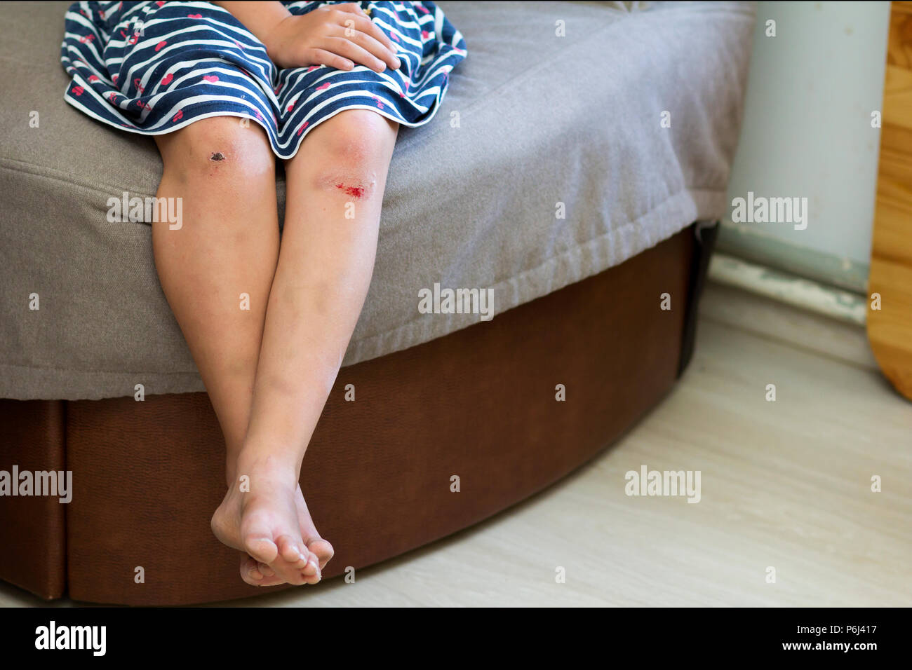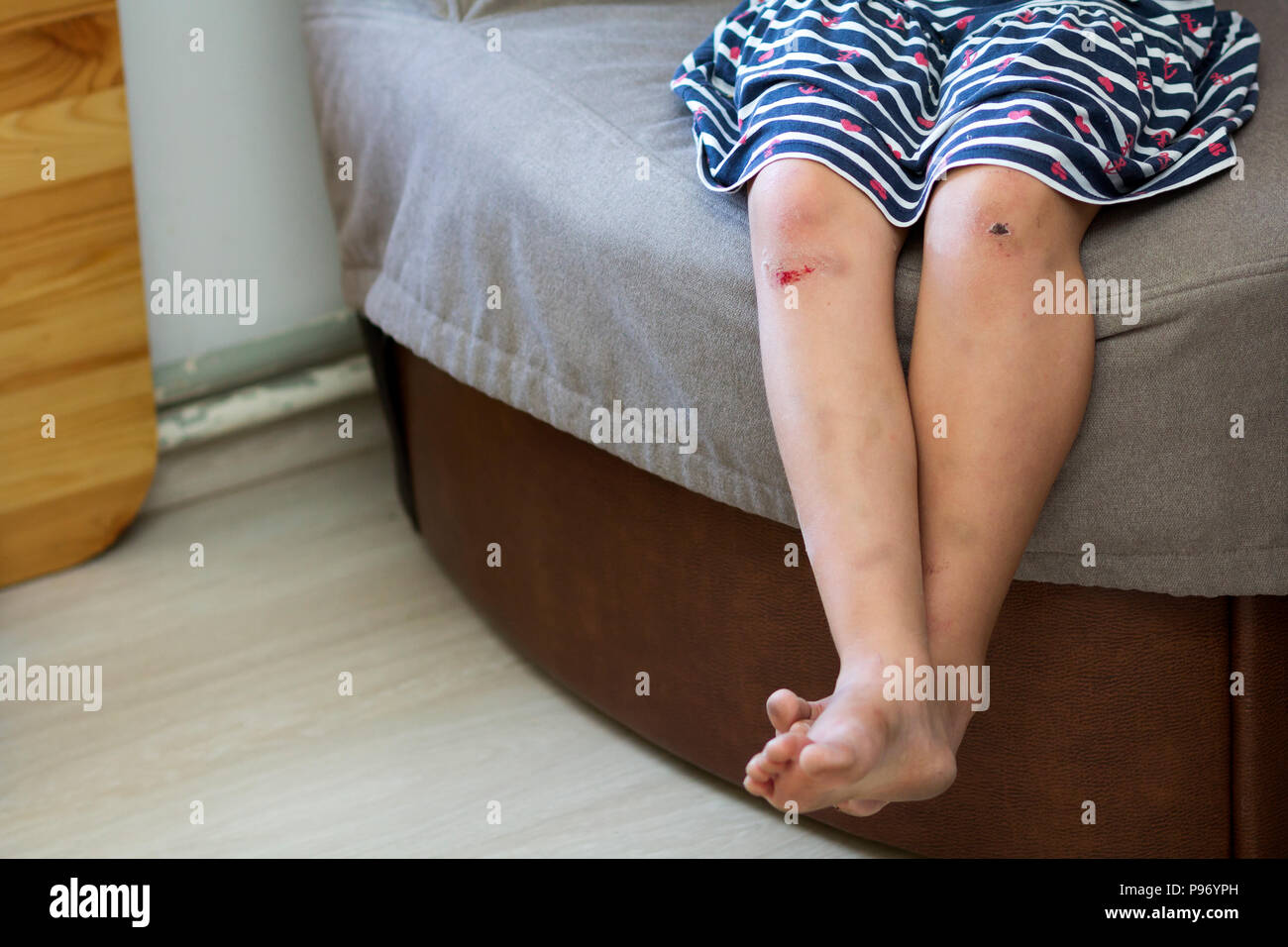 Close Up Di Giovane Ragazza Di Bambini Nudi Gambe Con Ammaccati Danneggiato Feriti Ginocchia Dopo La Caduta Con Vecchie Cicatrici E Sangue Fresco Bambini Traumi Accide Foto Stock Alamy
