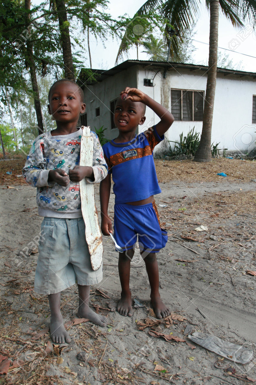 Immagini Stock Zanzibar Tanzania 20 Febbraio 2008 Bambini Sconosciuti A Piedi Nudi Pelle Scura Africani Eta Approssimativa Di 8 Anni La Gente Del Posto Paese Di Mare Stare In Mezzo