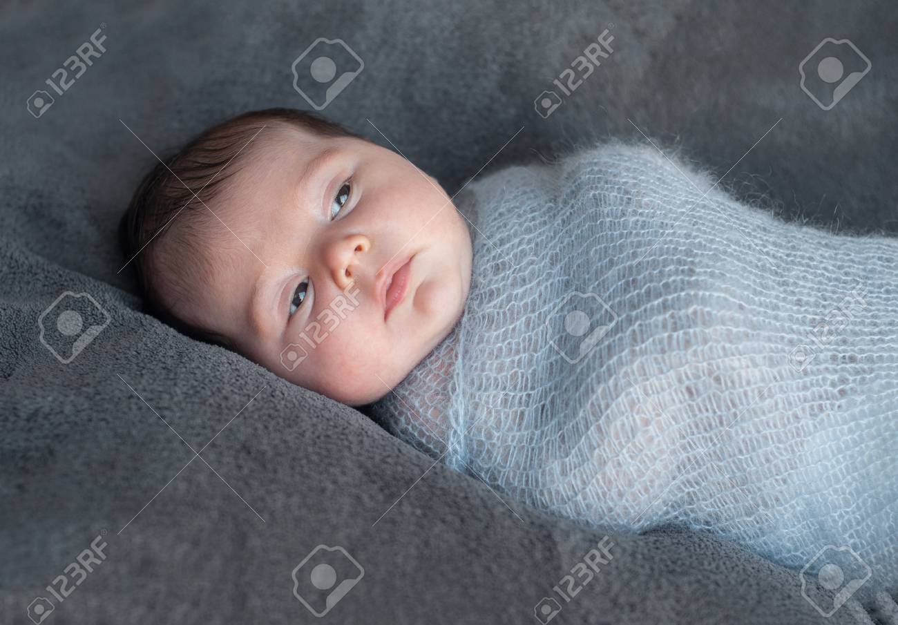 Immagini Stock Neonato Avvolto In Coperta Calda A Maglia Bello Ritratto Di Un Bambino Appena Nato Che E Sveglio E Guarda Intorno Image 74278167
