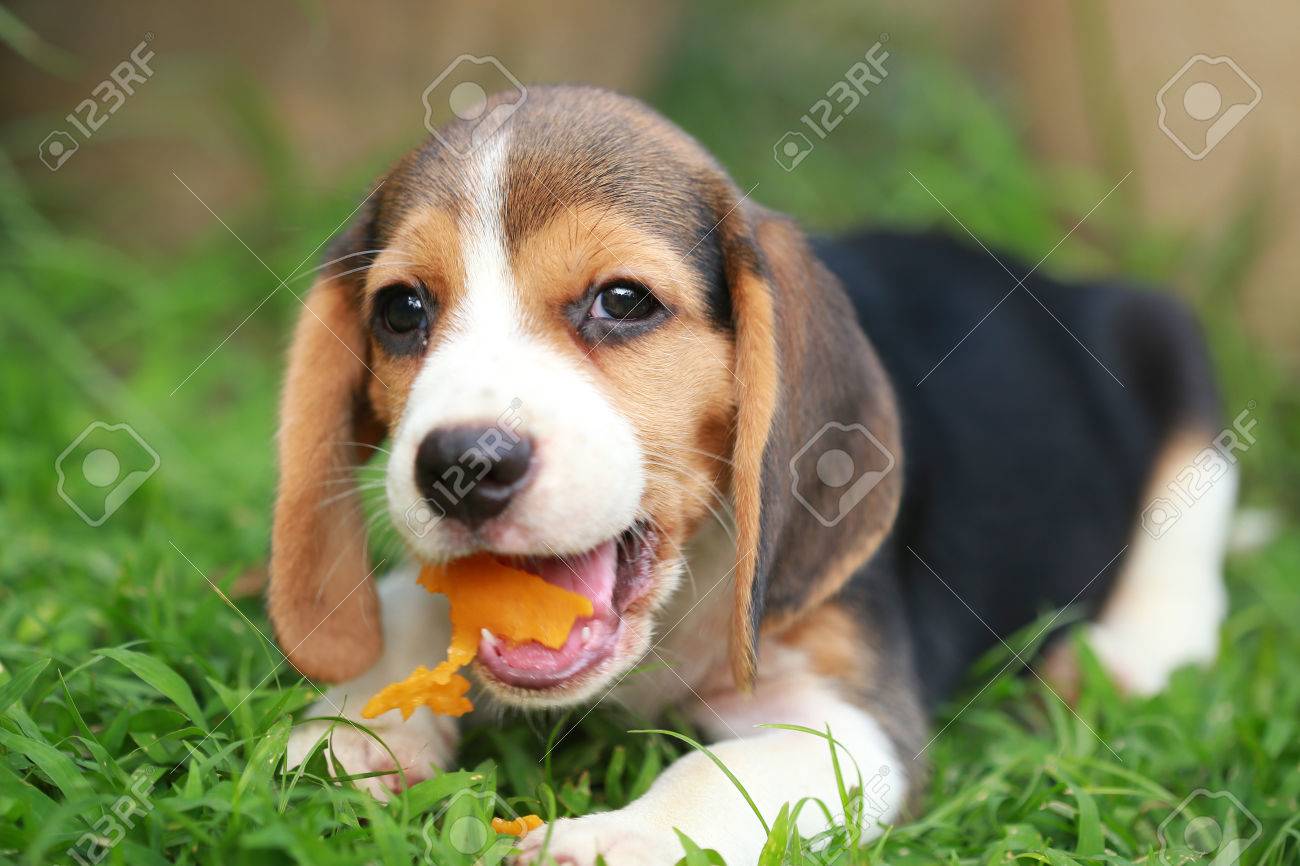 Immagini Stock Cucciolo Di Beagle Purosangue E Piace Mangiare Frutta 2 Mesi Di Cucciolo Maschio Beagle Forte Image 77356987