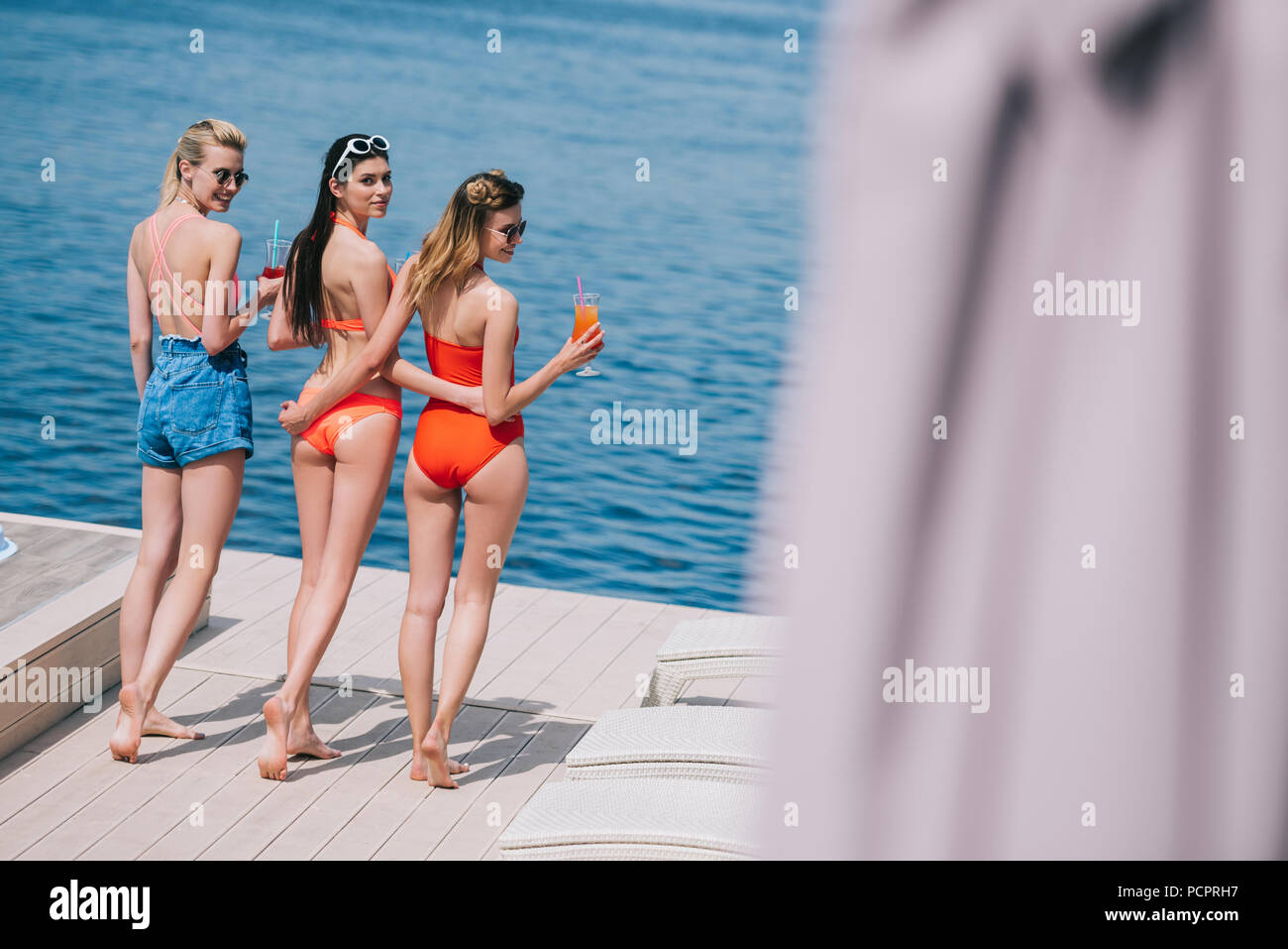 Multietnica Di Belle Ragazze In Costume Da Bagno In Posa E Tenendo Le Bottiglie Con Cocktail Foto Stock Alamy
