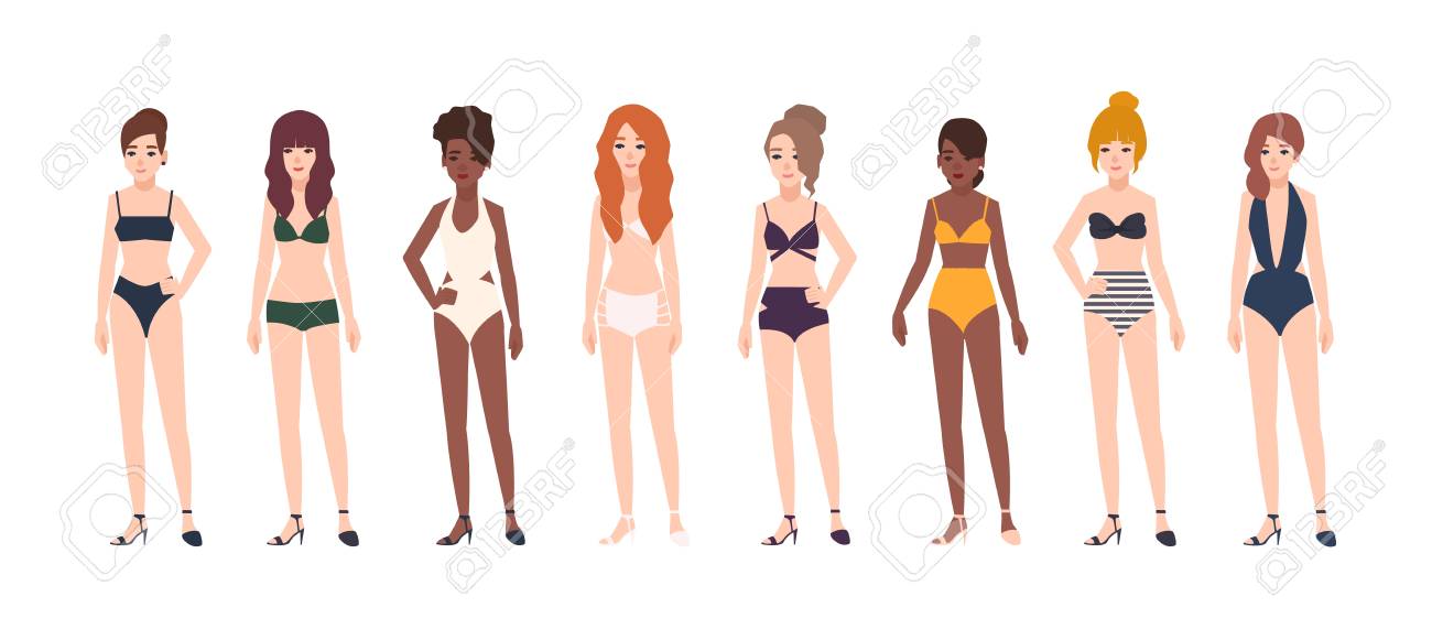 Immagini Stock Ragazze In Bikini Con Corpi Perfetta Vestibilita Gruppo Di Giovani Donne Attraenti Indoeuropea In Costume Da Bagno Su Bianco Image 19873904