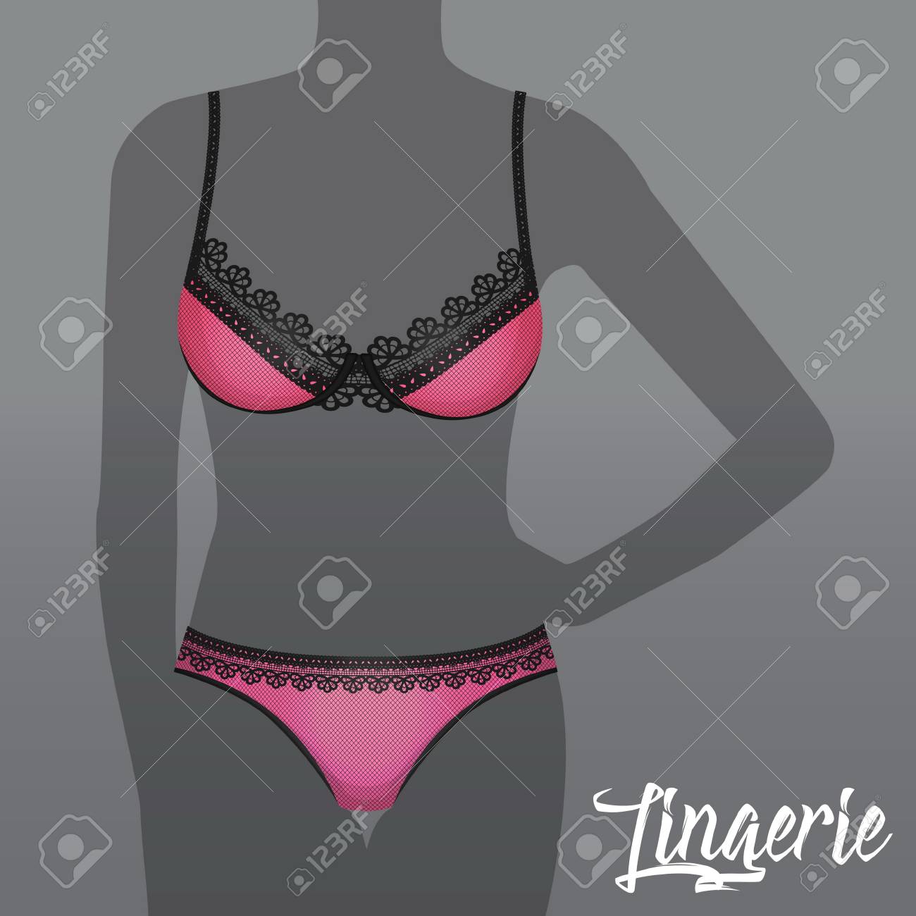 Vettoriale Modello Di Pubblicita Di Biancheria Intima Sexy Hot Lingerie Silhouette Donna Femminile E Mutandine Bikini Rosa E Reggiseno Con Decorazione In Pizzo Nero Image 95888377