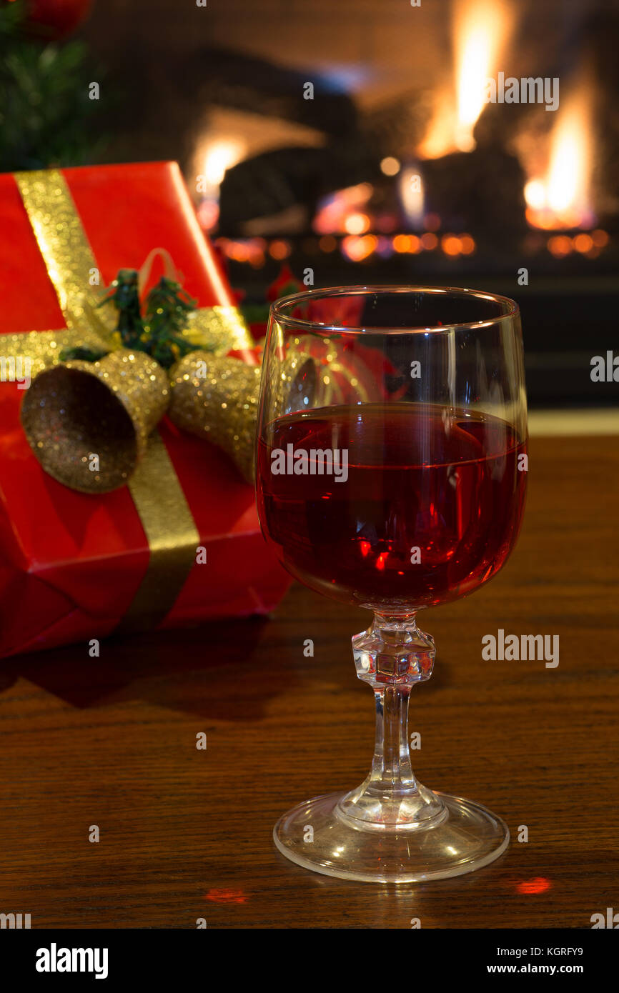 Bicchiere Di Vino Rosso Con Un Regalo Di Natale E Camino In Background Foto Stock Alamy