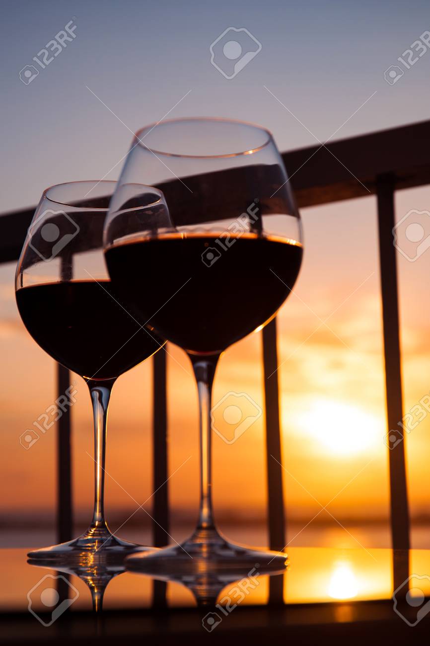 Immagini Stock Due Bicchieri Di Vino Rosso Di Fronte Al Tramonto Vista Del Balcone Con La Priorita Bassa Del Mare Caraibico Image 60031428
