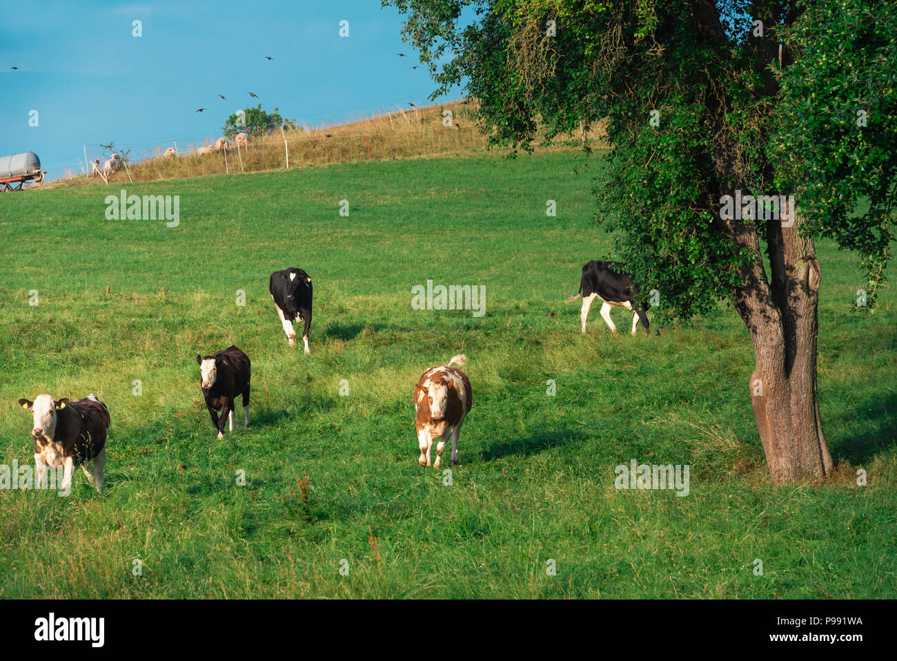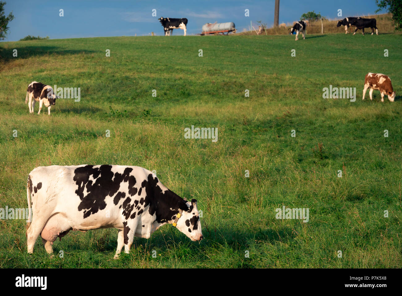 Paesaggio Paesaggio Estivo Con Un Allevamento Di Bovini Di Razza Frisona Di Vacche Da Latte Pascolo Su Di Una Collina Nella Luce Del Mattino Vicino Schwabisch Hall Germania Foto Stock Alamy