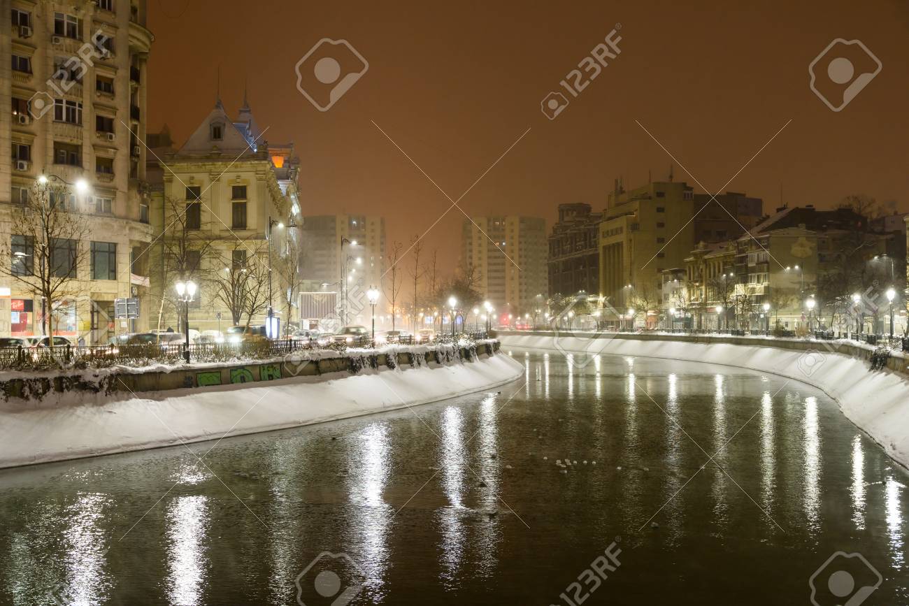 Immagini Stock Bucharest Romania 8 Gennaio 2017 Tempesta Della Neve Invernale Alla Citta Di Bucarest Alla Notte Image 69200122