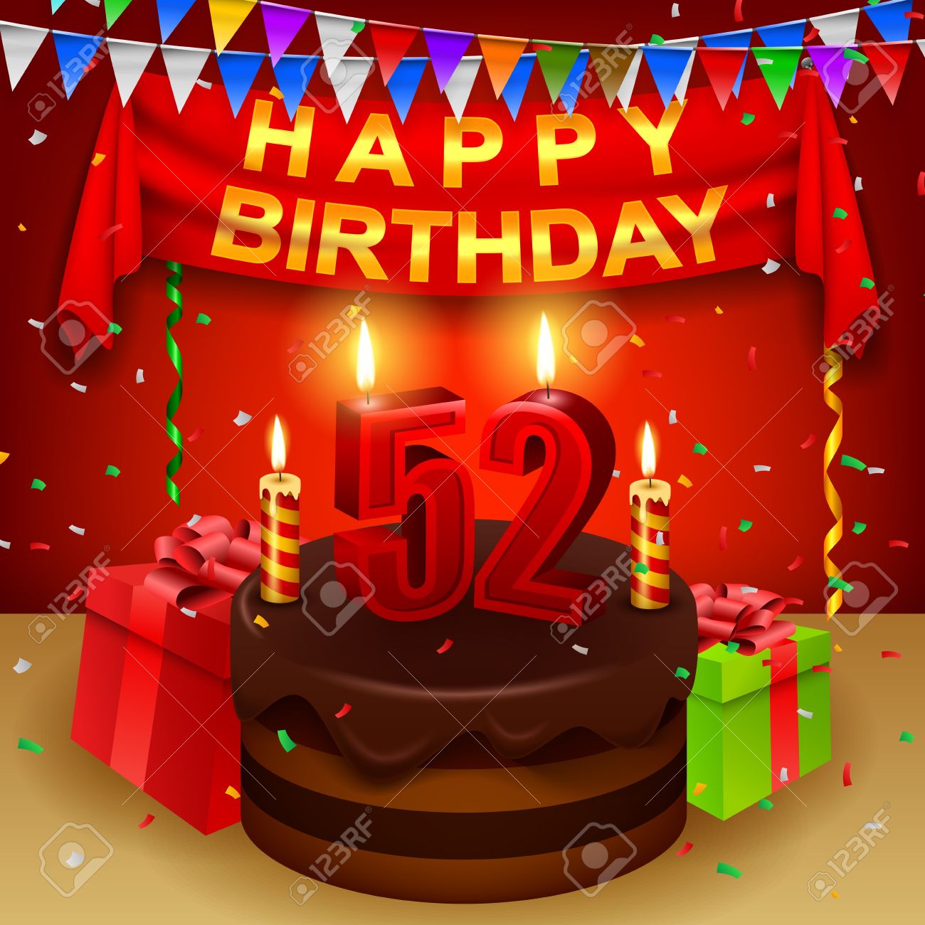 Vettoriale Buon Compleanno 52 Con La Torta Di Crema Al Cioccolato E La Bandiera Triangolare Image 54765221