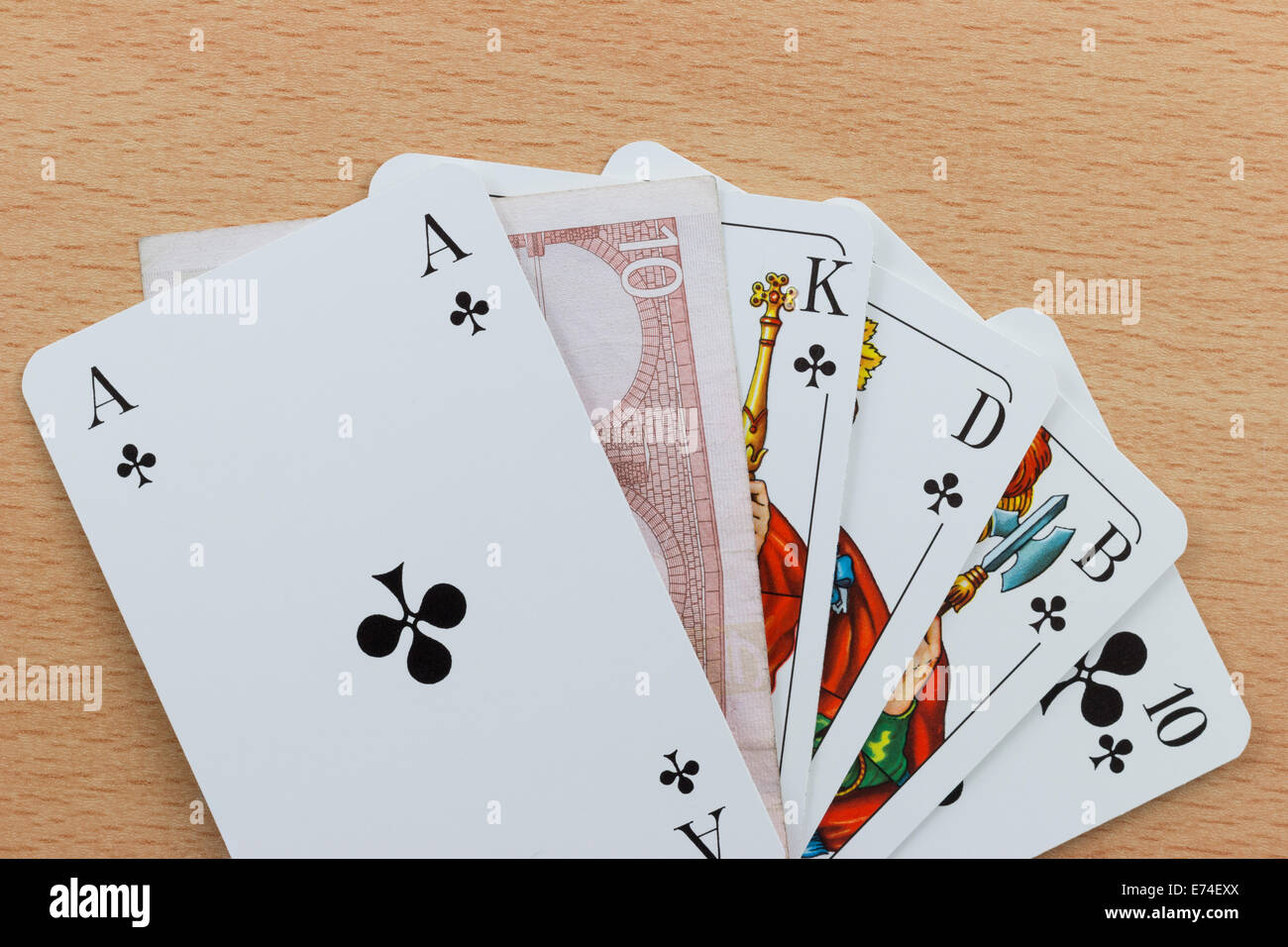Mazzo Di Carte Da Poker Che Mostra Un Royal Flush Con Un Euro Nota Foto Stock Alamy
