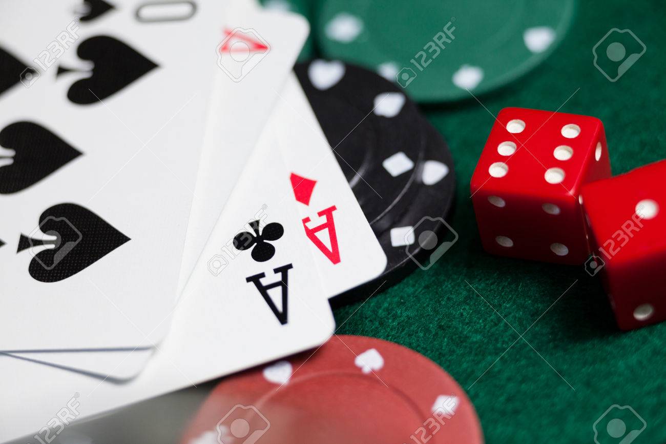 Immagini Stock Close Up Di Carte Da Gioco Dadi E Fiches Del Casino Sul Tavolo Da Poker Image 81861901