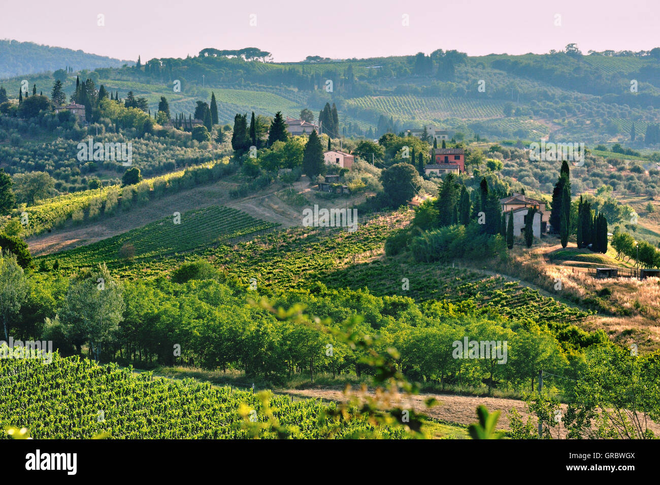 Case Nel Paesaggio Di Colline Con Cipressi E Vite In Toscana A Luce Morbida Toscana Italia Foto Stock Alamy