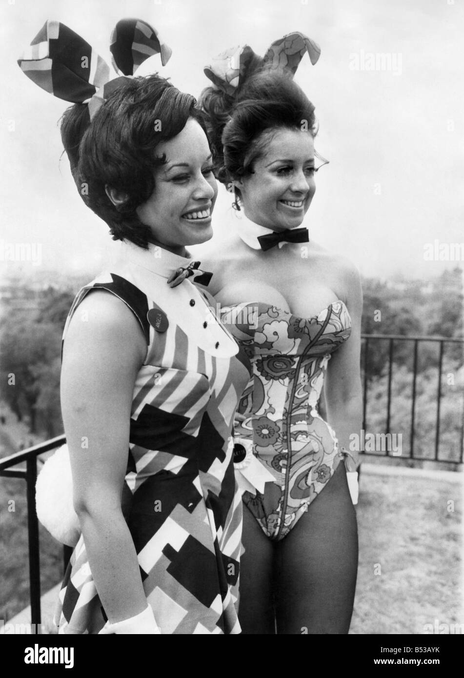 Conigliette Di Playboy Una Donna Che Indossa Un Basco L Altro Indossa Un Abito Plus Cravatte Orecchie Di Coniglio E La Coda Sulla Veranda Con Vista Campagna Maggio 1970 P018490 Foto Stock