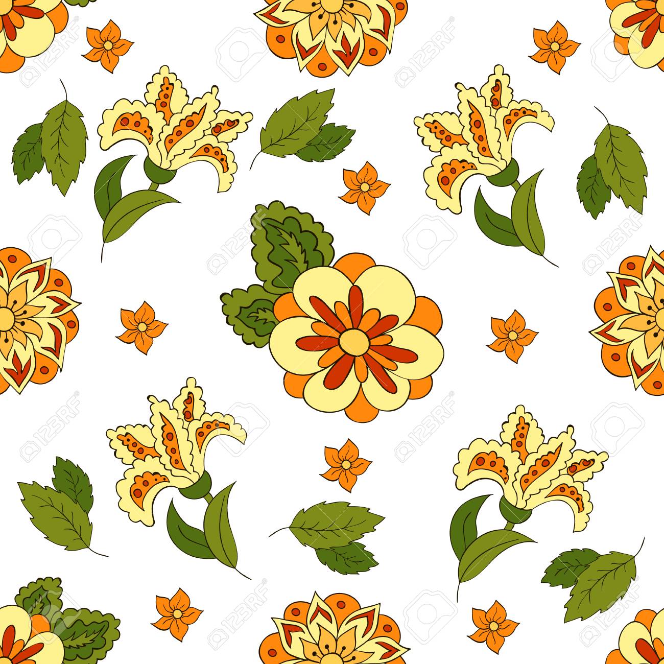 Vettoriale Modello Bianco Senza Soluzione Di Continuita Con I Fiori Di Primavera Copertina Sfondo Colori Arancioni E Verdi Image 68140799