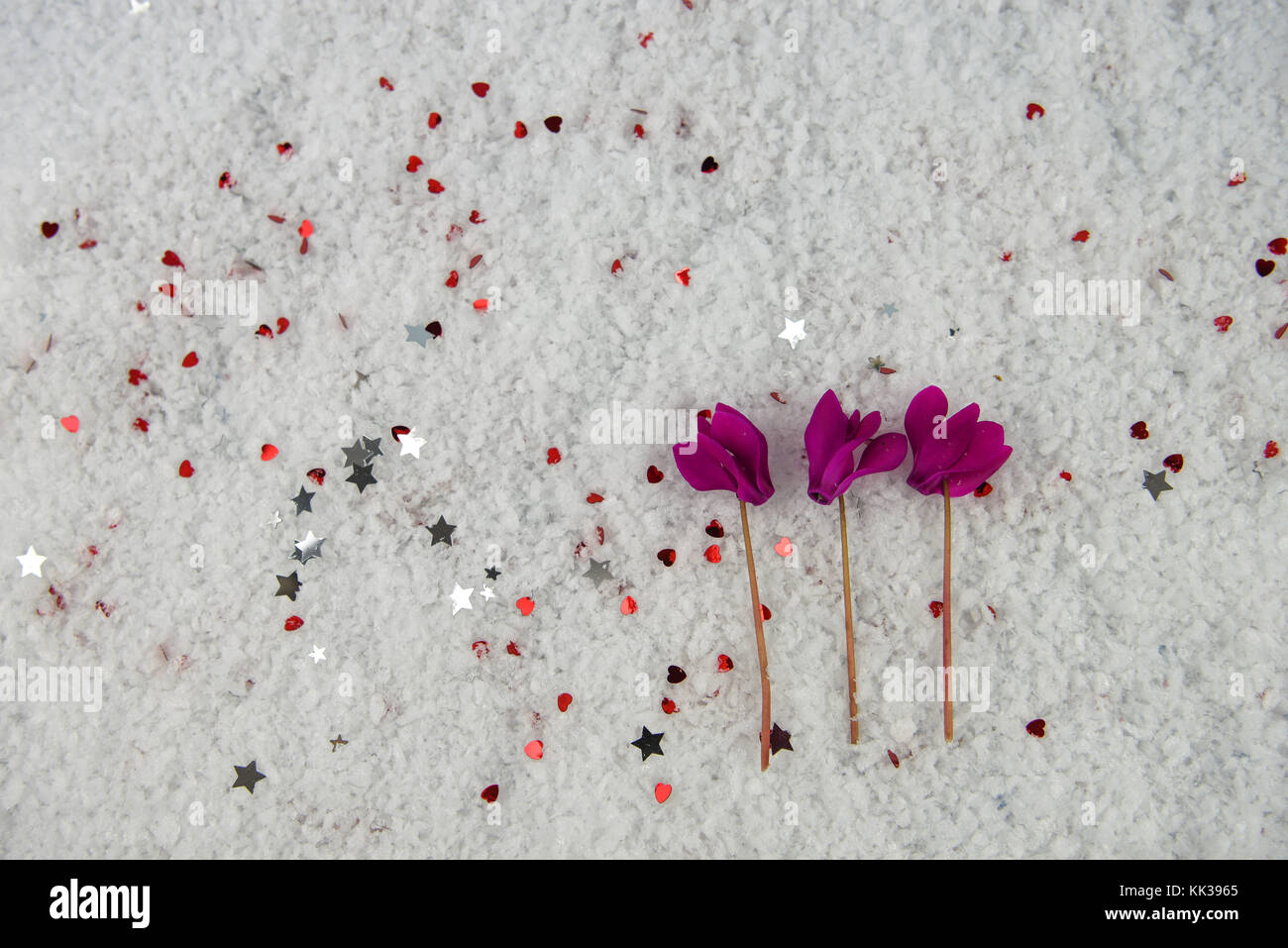 Inverno Immagine Di Fotografia Con Taglio Freschi Fiori Stagionali Di Rosa Viola Ciclamino Nella Neve E Spolverati Con Cuori Rossi Piccoli E Argento Stelle Foto Stock Alamy