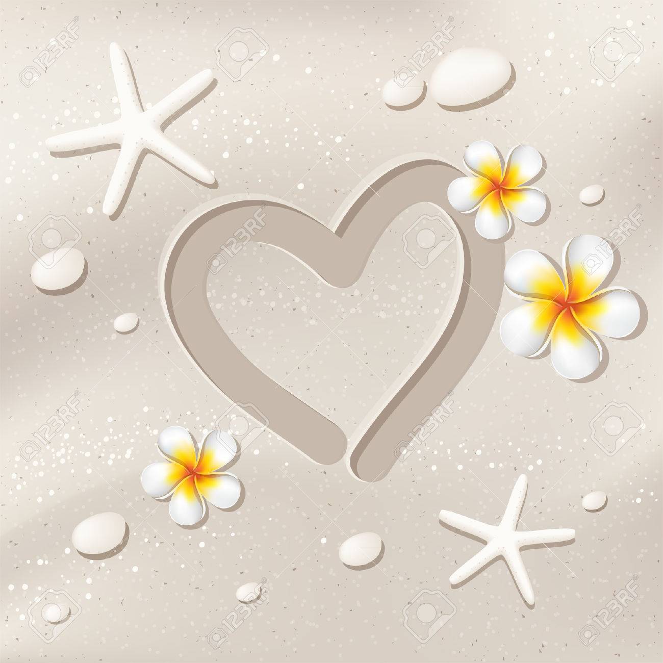 Vettoriale Priorita Bassa Della Sabbia A Forma Di Cuore Stelle Marine Pietre E Fiori Di Frangipani Estate Spiaggia Amore Illustrazione Vettoriale Viaggio Image 30174752