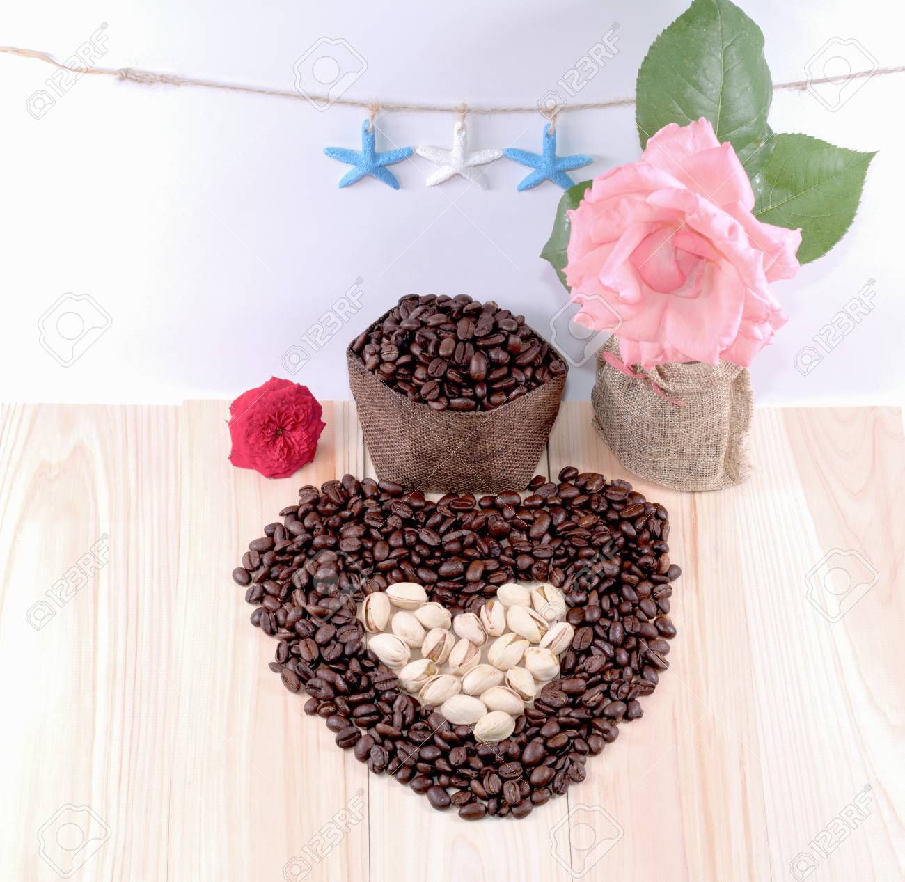 Immagini Stock Cuore Di Chicchi Di Caffe E Pistacchio Con Fiore Stelle Marine E Sfondo Bianco Image 79728809