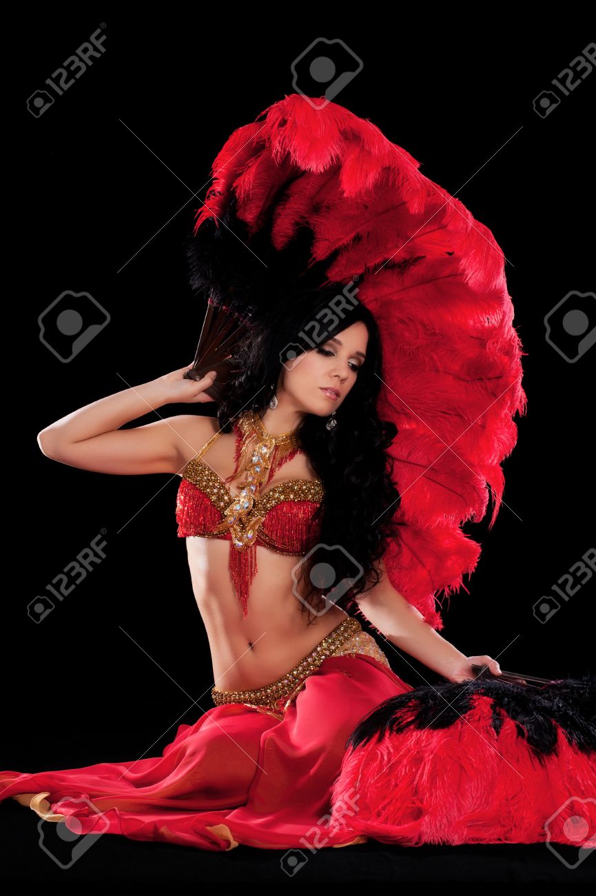 Immagini Stock Ritratto Di Una Bella Danzatrice Del Ventre Indossa Un Costume Di Danza Del Ventre Rosso Lei E Seduta E Posa Con Ventagli Di Piume Isolato Su Fondo Nero Image 23956420