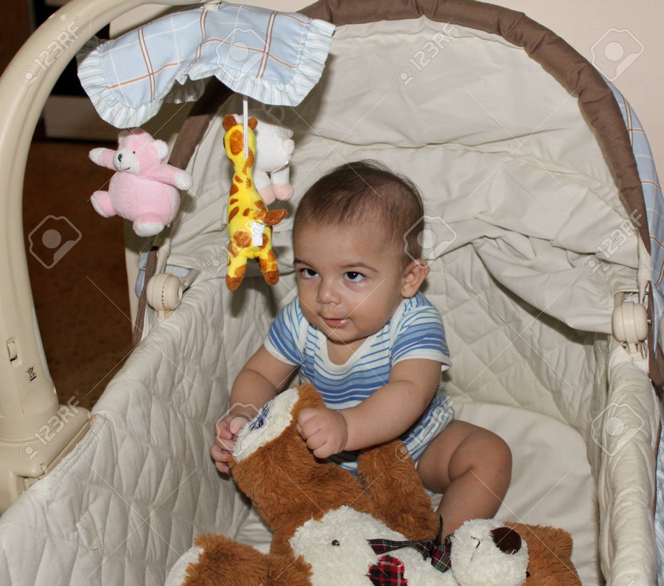 Immagini Stock Bambino Di Cinque Mesi Nella Culla A Fare Facce Buffe Image 88246225