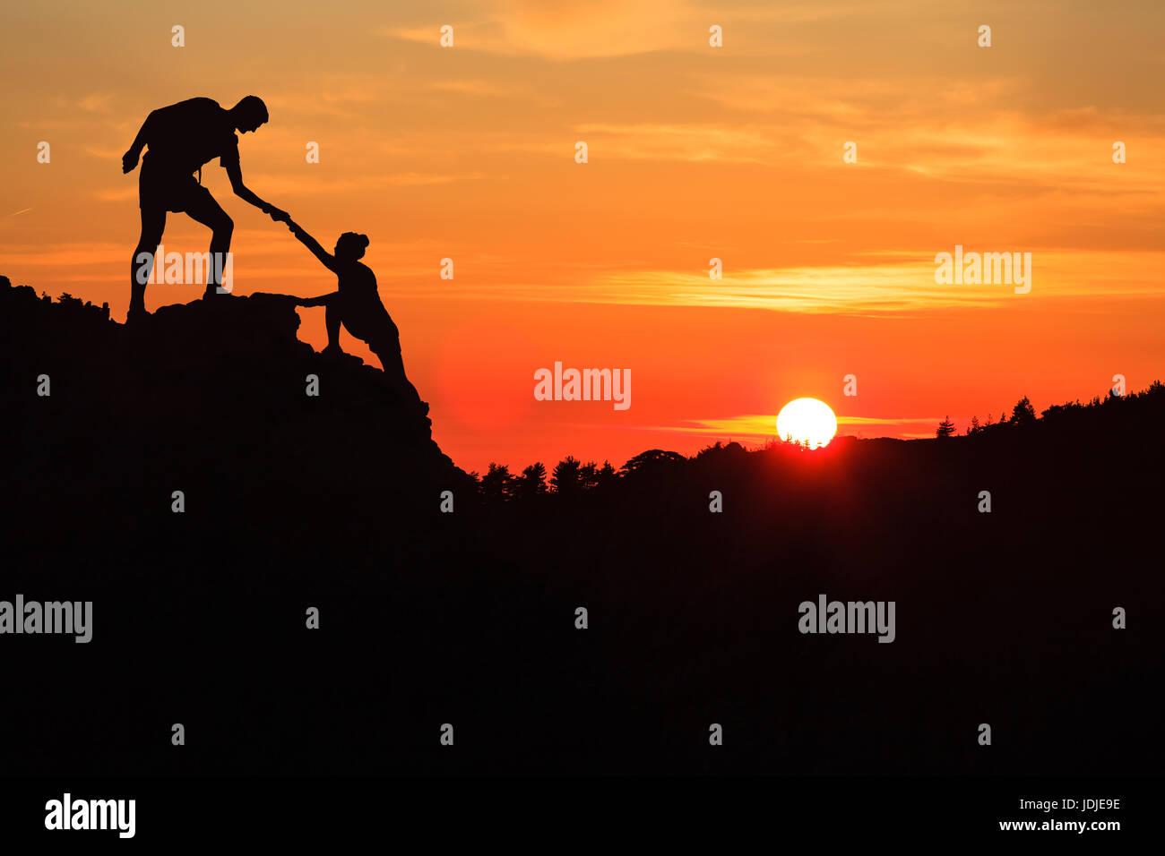 Il Lavoro Di Squadra Giovane Mano Silhouette Di Fiducia Per Ispirare Le Montagne Team Di Assistenza Per Scalatori Di Uomo E Donna Escursionista Si Aiutano A Vicenda Sulla Sommita Del Monte Foto