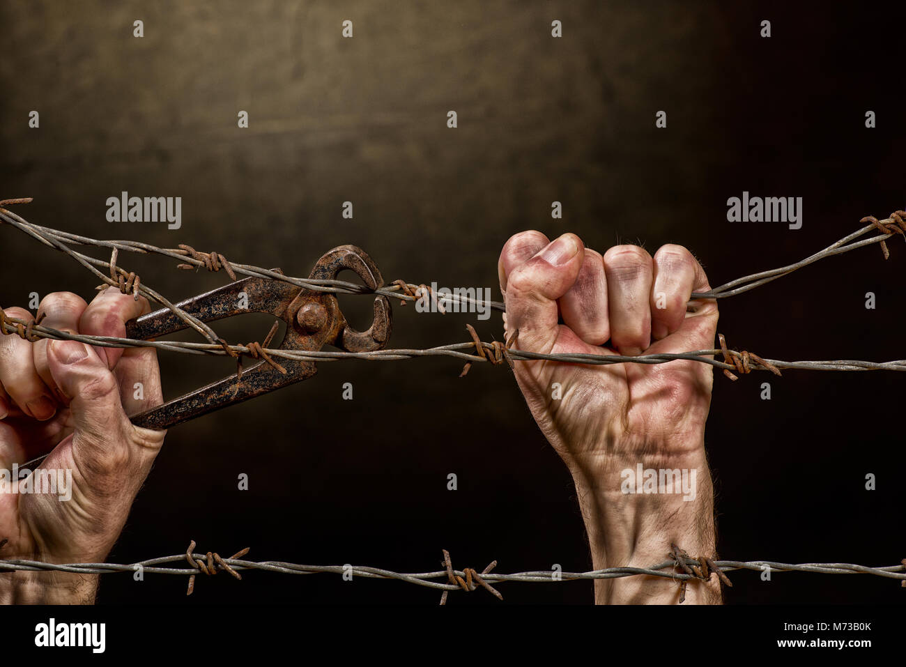 L Uomo E Il Taglio Di Un Recinto Di Filo Spinato Foto Stock Alamy