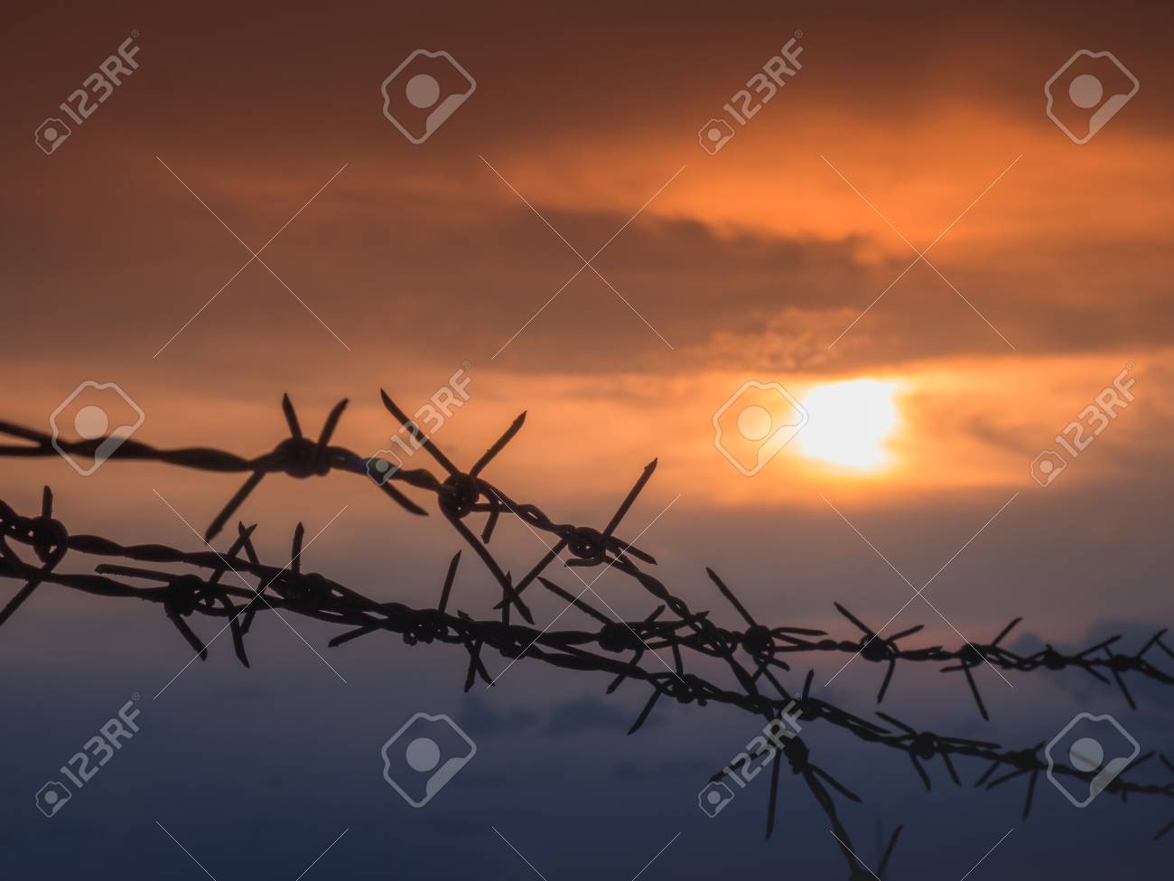 Immagini Stock Recinto Di Filo Spinato Con Cielo Di Twilight Per Sentirsi Silenzioso E Solitario E Vuole La Liberta Image 69130228