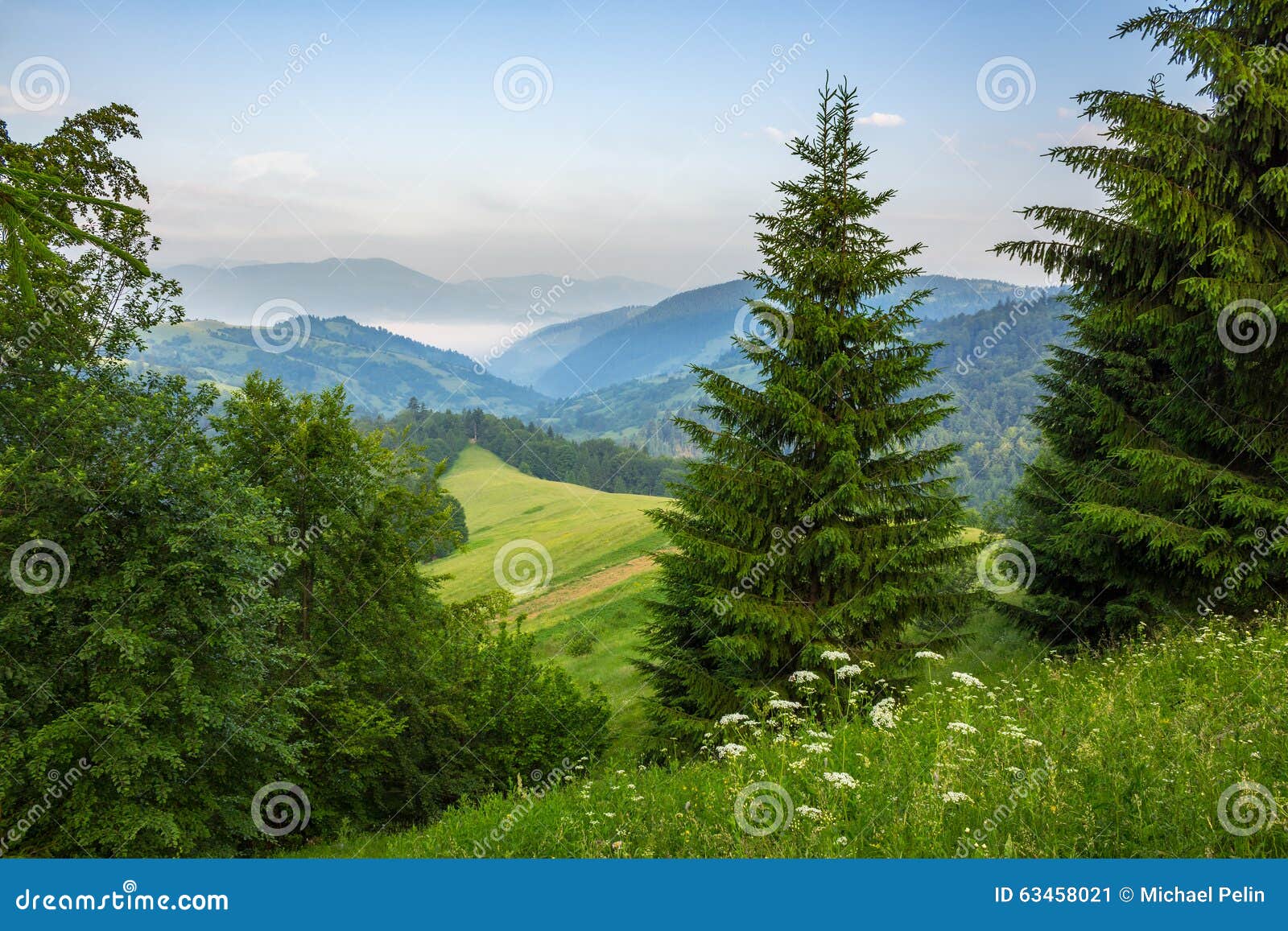 Immagini Stock Abeti Su Un Prato Giu La Volonta Della Foresta Di Conifere Nelle Montagne Nebbiose Della Cina Image 70284480