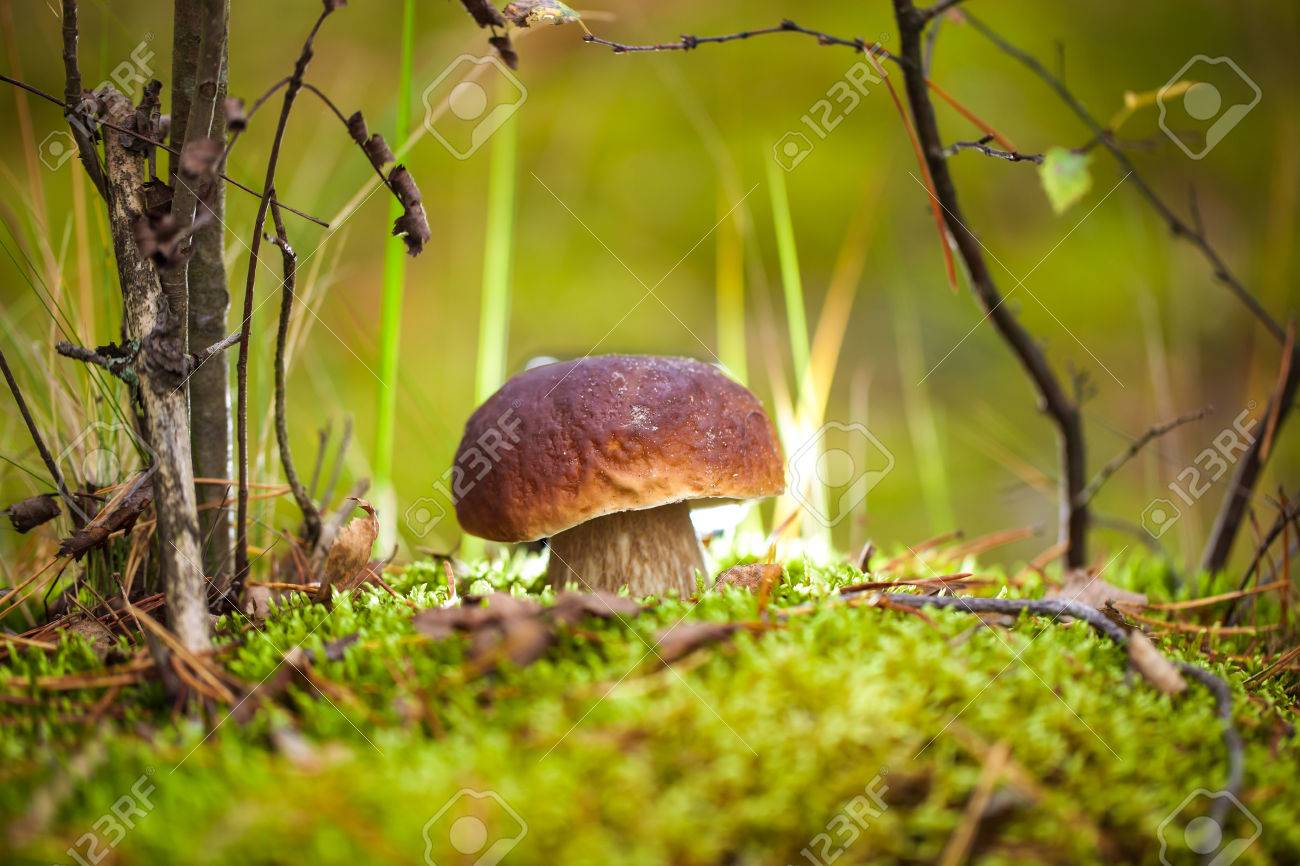 Immagini Stock Funghi Porcini Nel Muschio In Una Radura Nel Bosco Messa A Fuoco Selettiva Profondita Di Campo Tonica Image 64071427