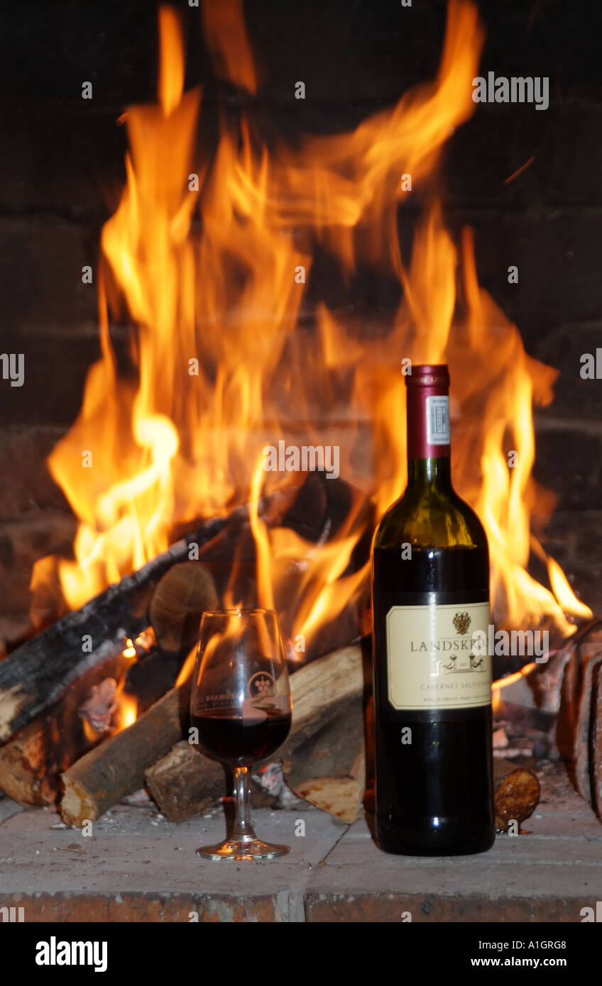 La Combustione Del Legno Fiamme Di Fuoco Una Bottiglia Di Vino E Acceso Foto Stock Alamy